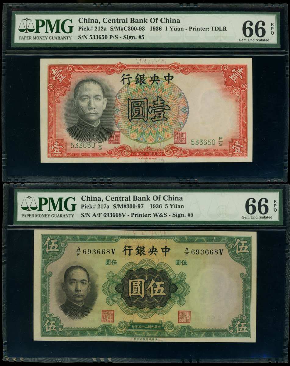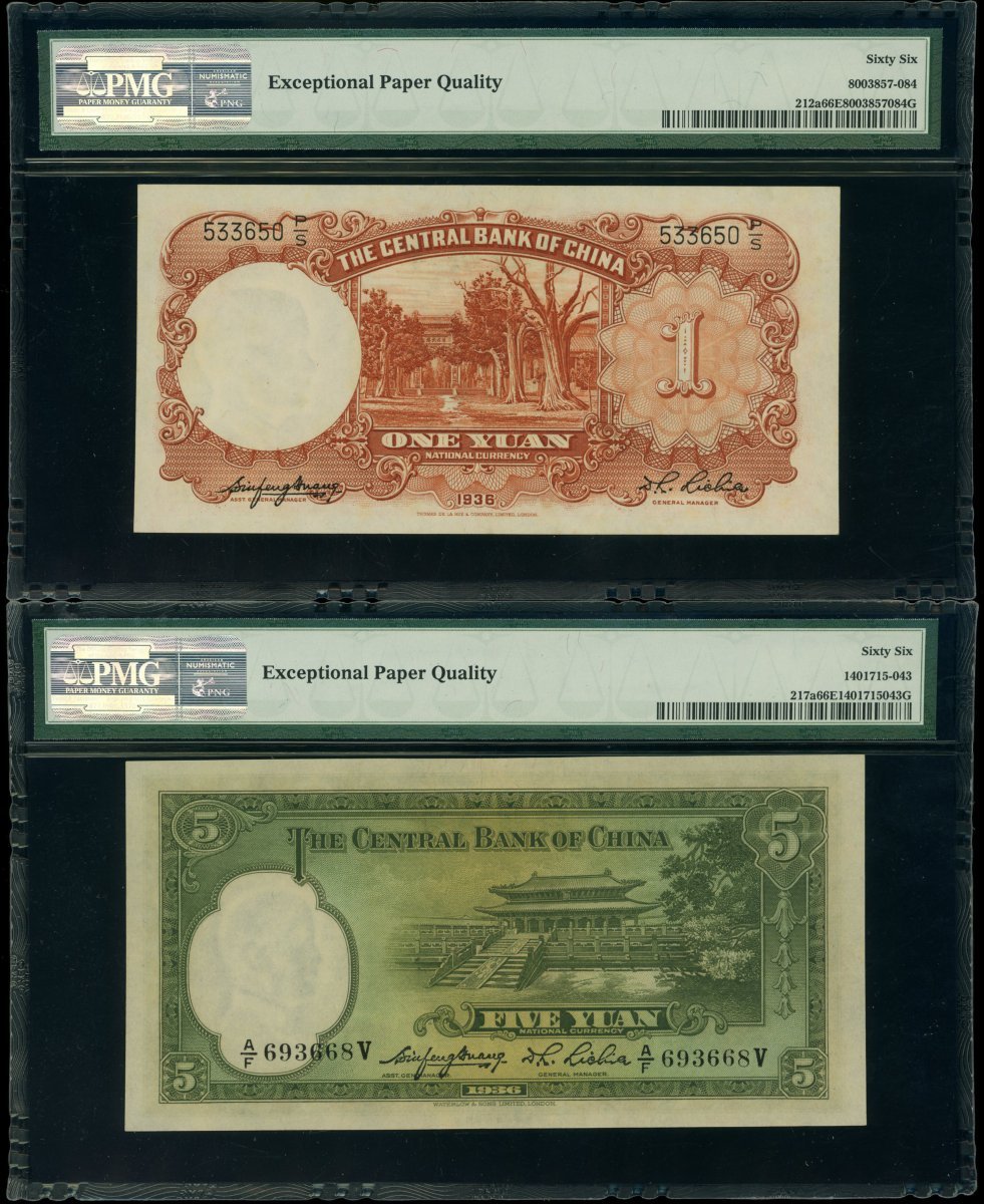 民國二十五年(1936)中央銀行壹圓及伍圓一對,編號533650P/S及A/F693668V,均評PMG 66EPQ