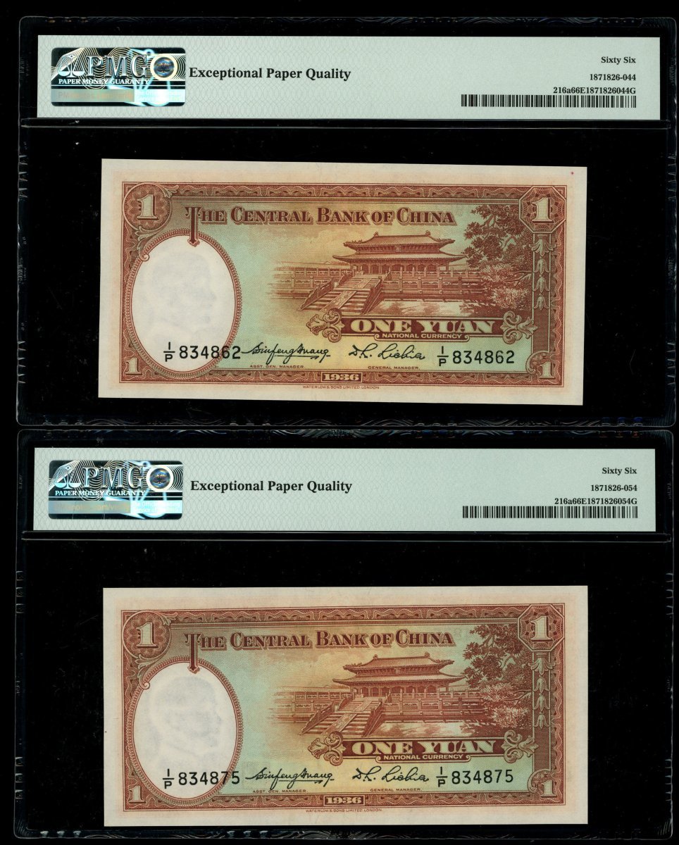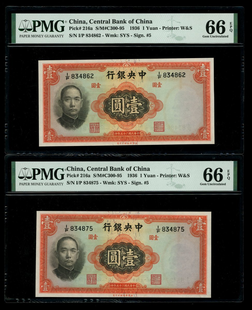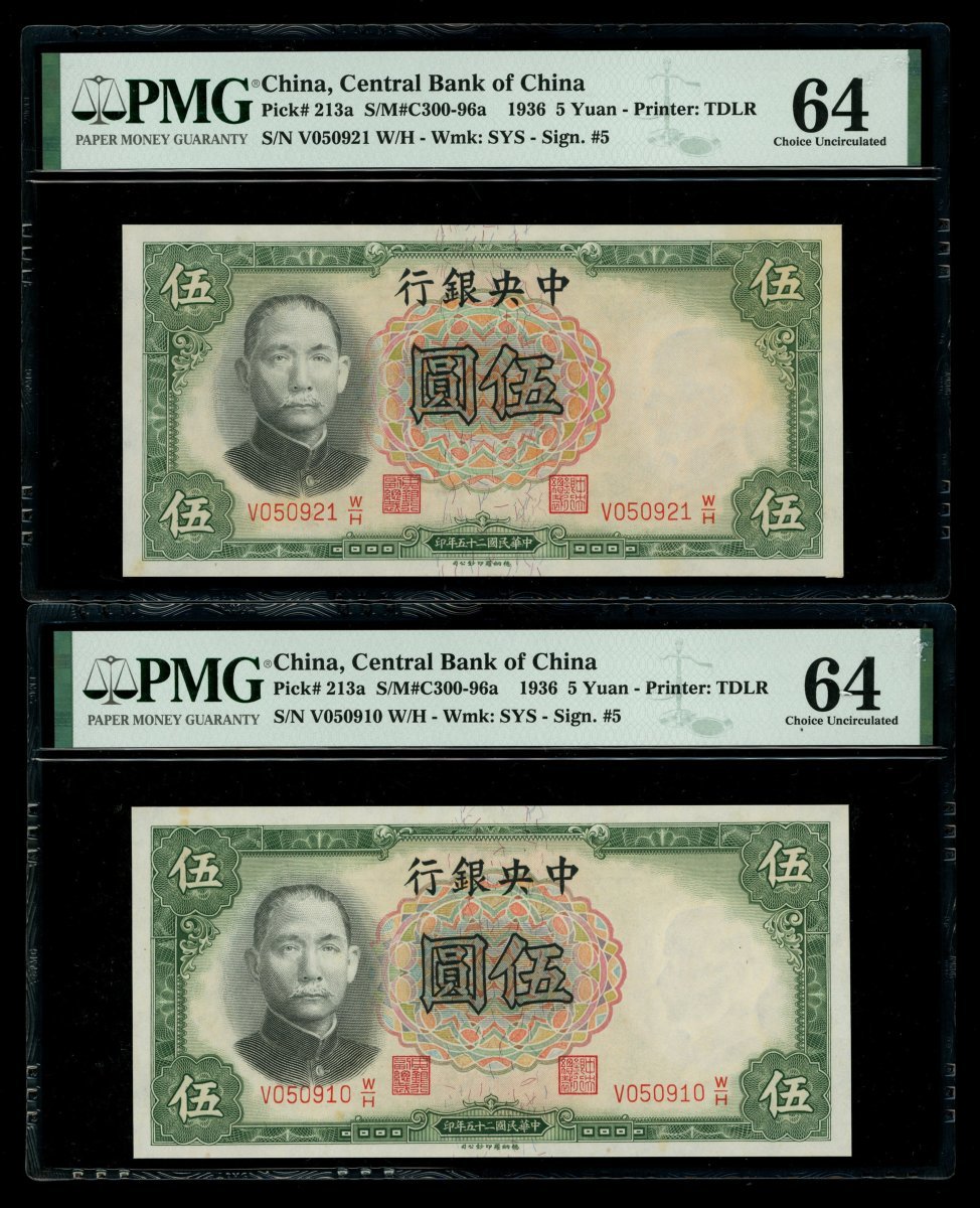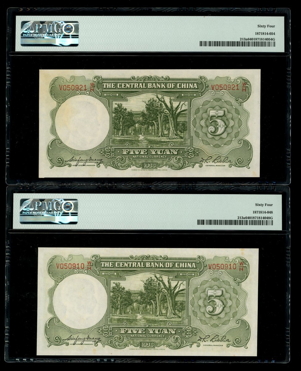 民國二十五年(1936)中央銀行壹圓及伍圓各二,詳見圖示,分別評PMG 66EPQ及64