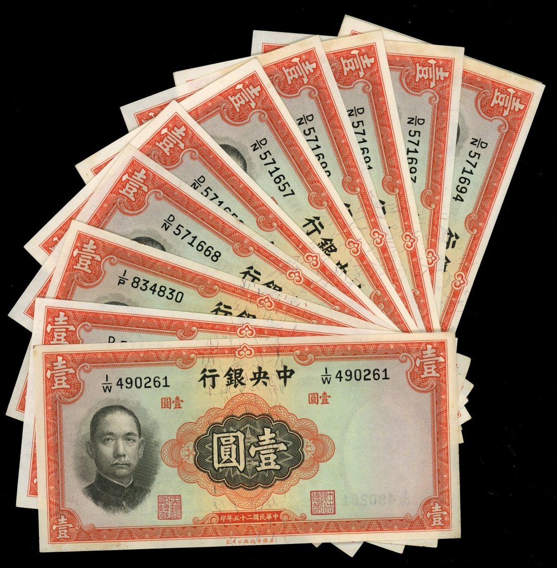 民國二十五年(1936)中央銀行壹圓一組15枚,UNC,若干連號票,輕微處理痕跡,帶黃