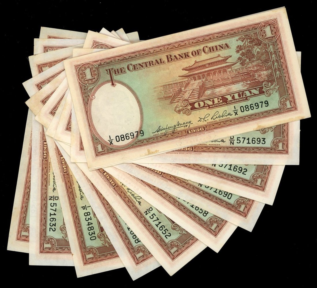 Central Bank of China, group of 15x 1 yuan, 1936, uncirculated, some short runs, light handling marks, toning etc (15)