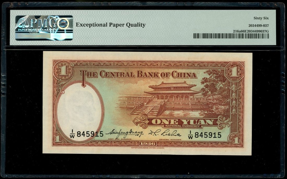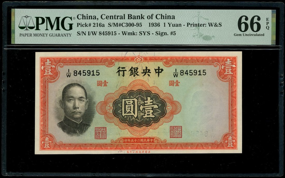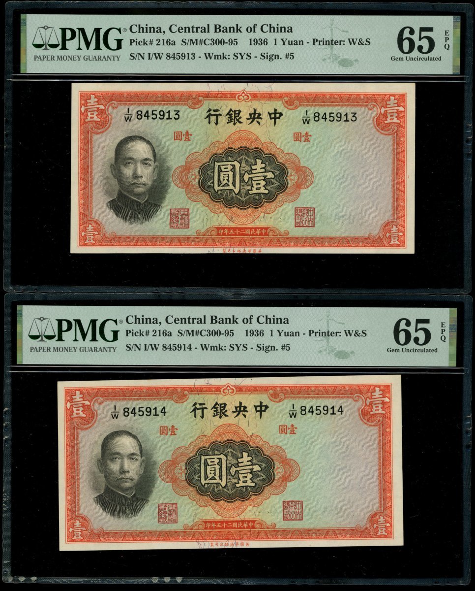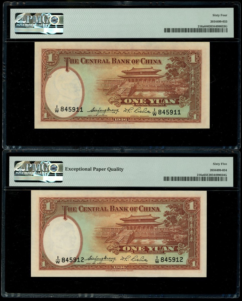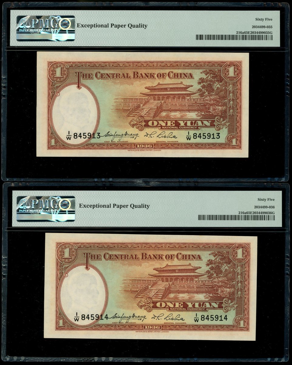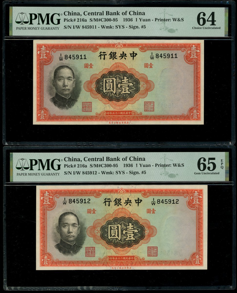 民國二十五年(1936)中央銀行壹圓連號5枚,編號I/W845911-5,第一枚評PMG 64,最後一枚評66EPQ,其餘65EPQ