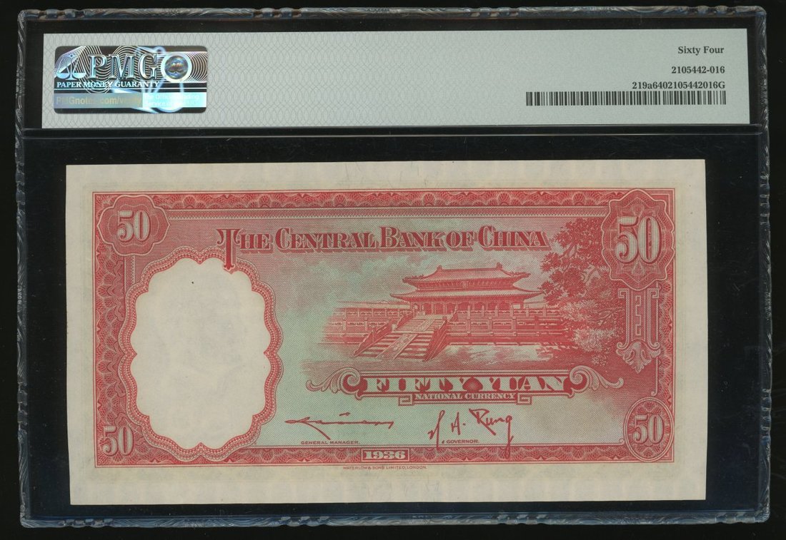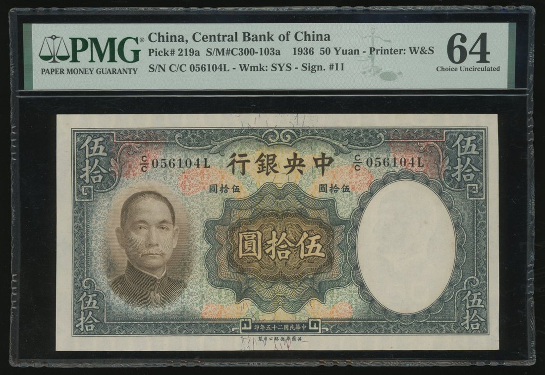 民國二十五年(1936)中央銀行伍拾圓,編號C/C 056104L,PMG 64