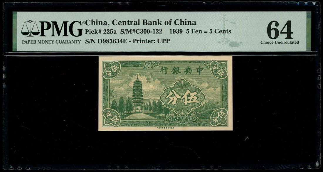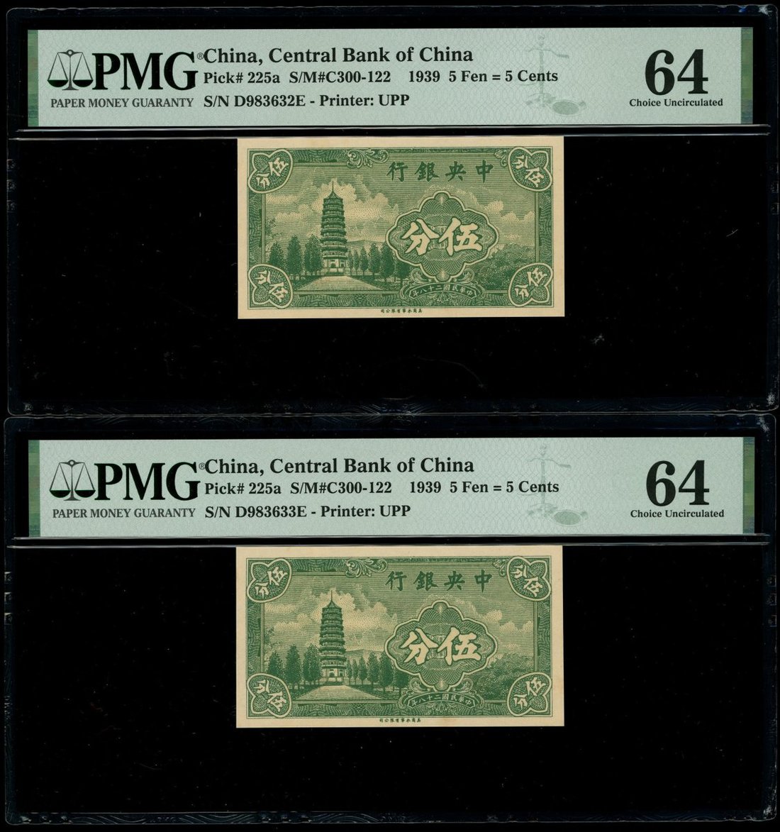Central Bank of China, a consecutive run of 5x 5 fen, 1939, #D983630-634E, (Pick 225a), all graded PMG 64 Choice Uncirculated (5)
