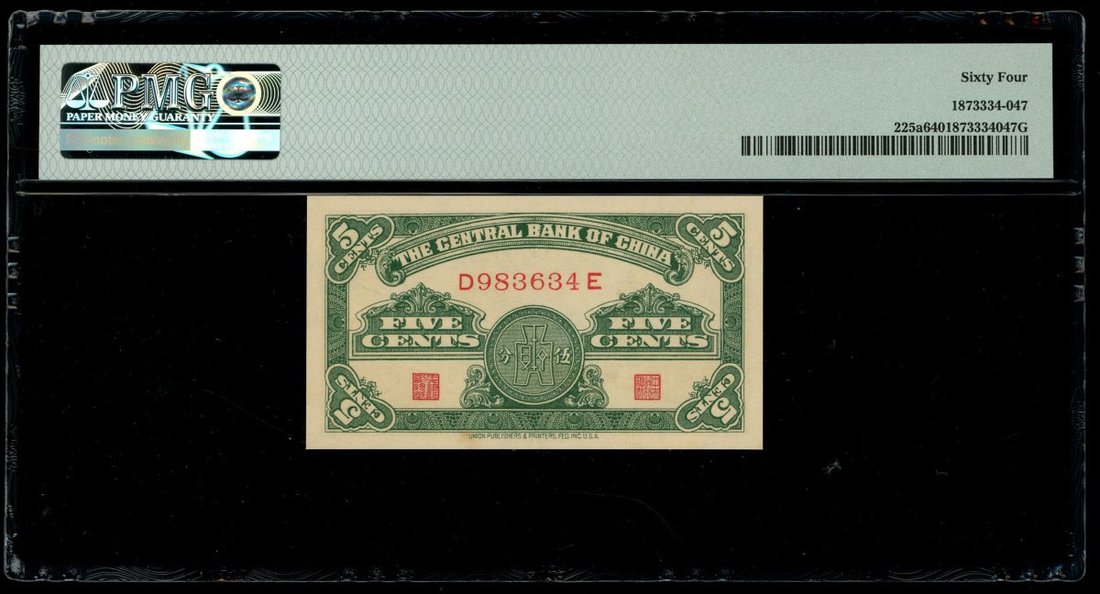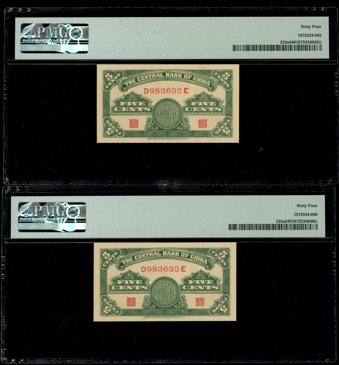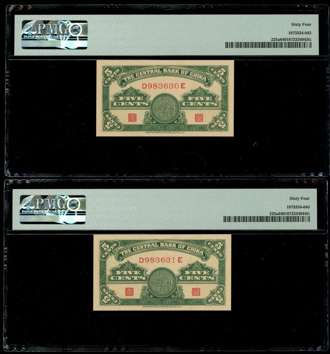 民國二十八年中央銀行伍分連號5枚,編號D983630-634E,均PMG 64
