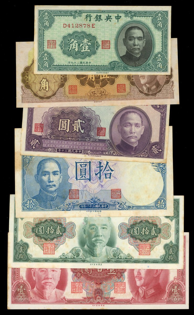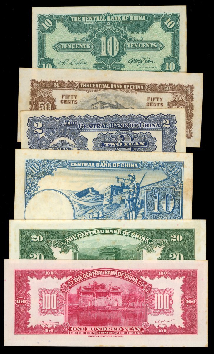 Cetnral Bank of China, a group of 6x notes, consists of 10 cents, 1940, 50 cents, 1948, 2 yuan, 1941, 10 yuan, 192, 20 yuan, 1945 and 100 yuan, 1945, serial numbers D412878E, AG536424, A143200K, SN530036, EC498907 and 090254, (various picks), extremely fine, with toning (6).