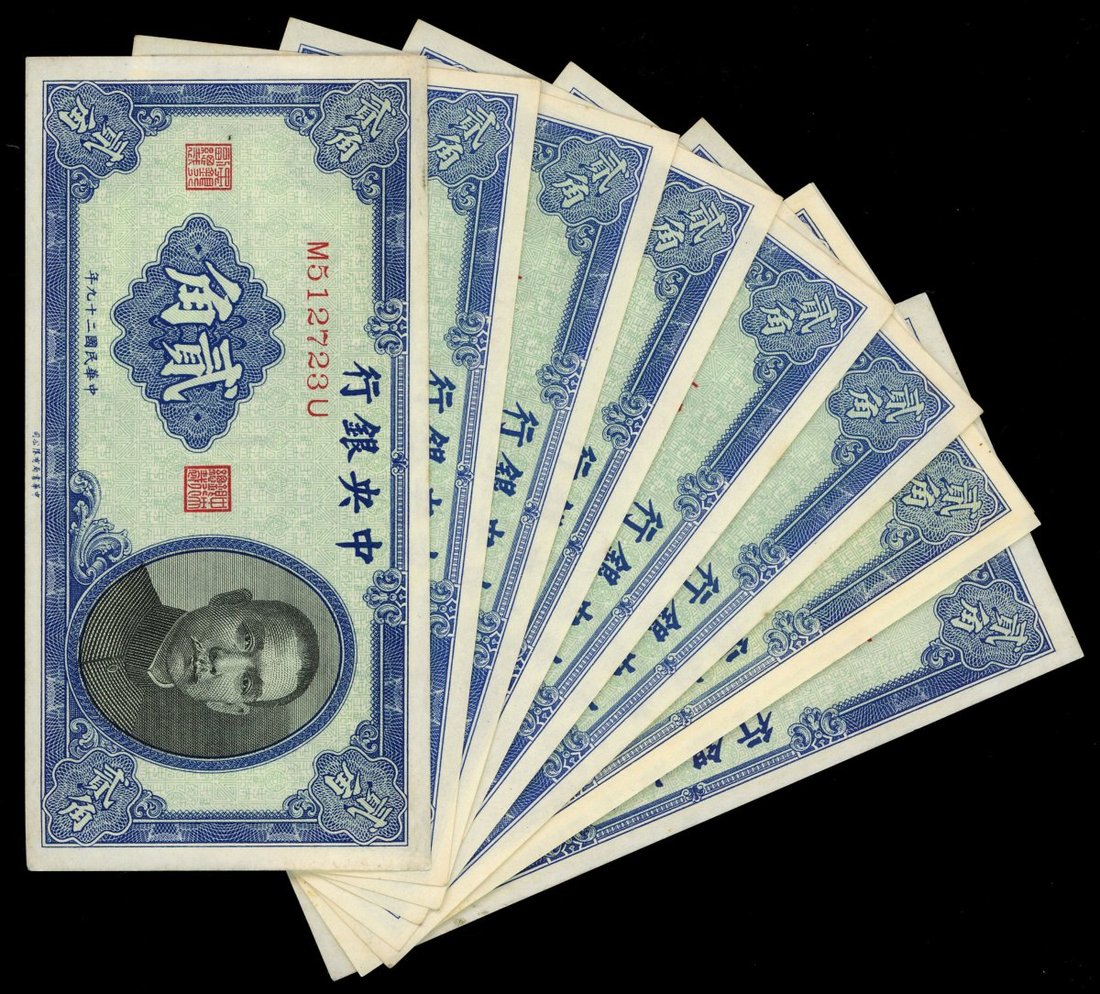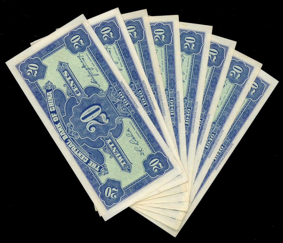 民國二十九年(1940)中央銀行貳角一組9枚,UNC,數枚有微黃,輕微處理痕跡