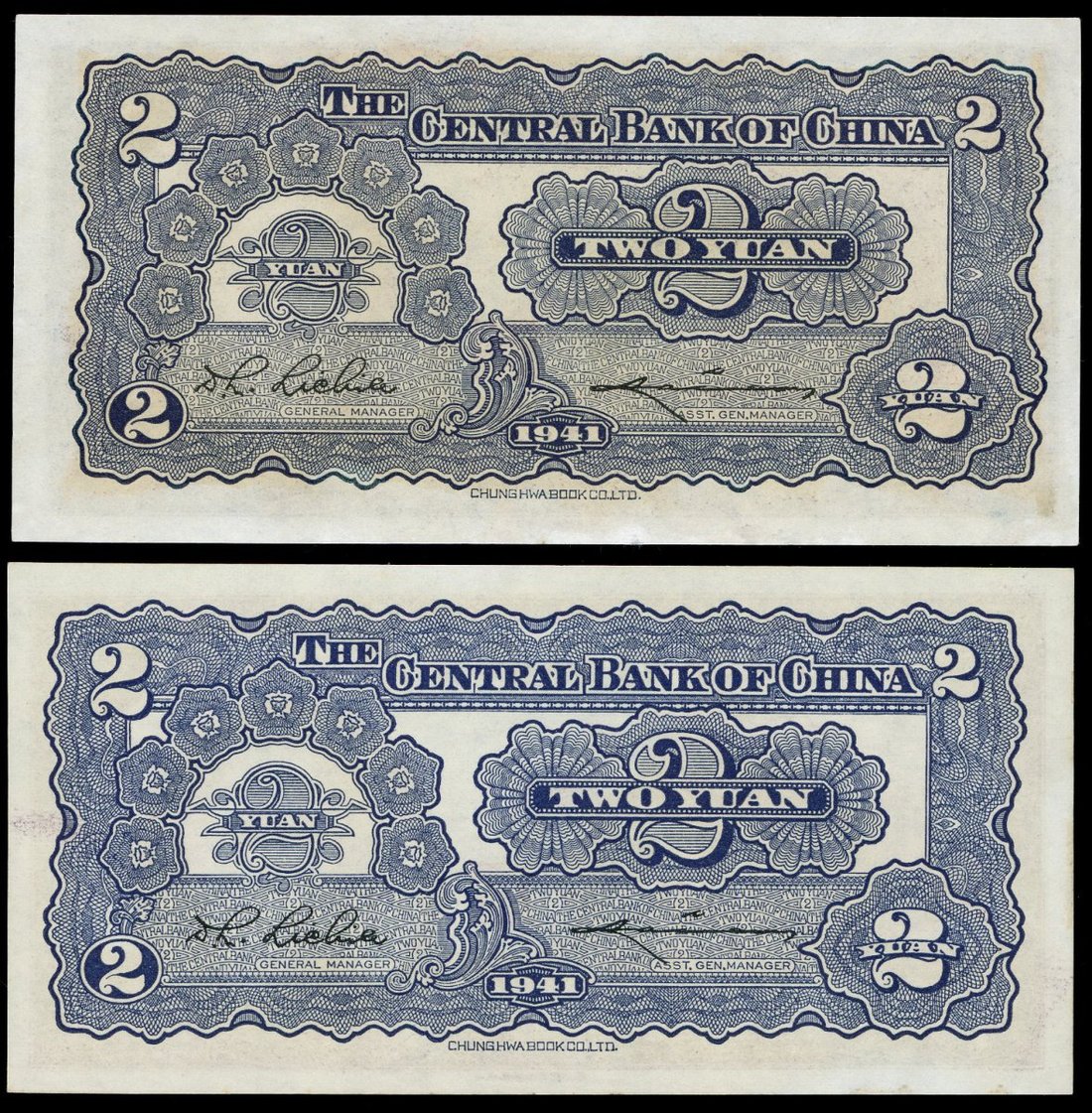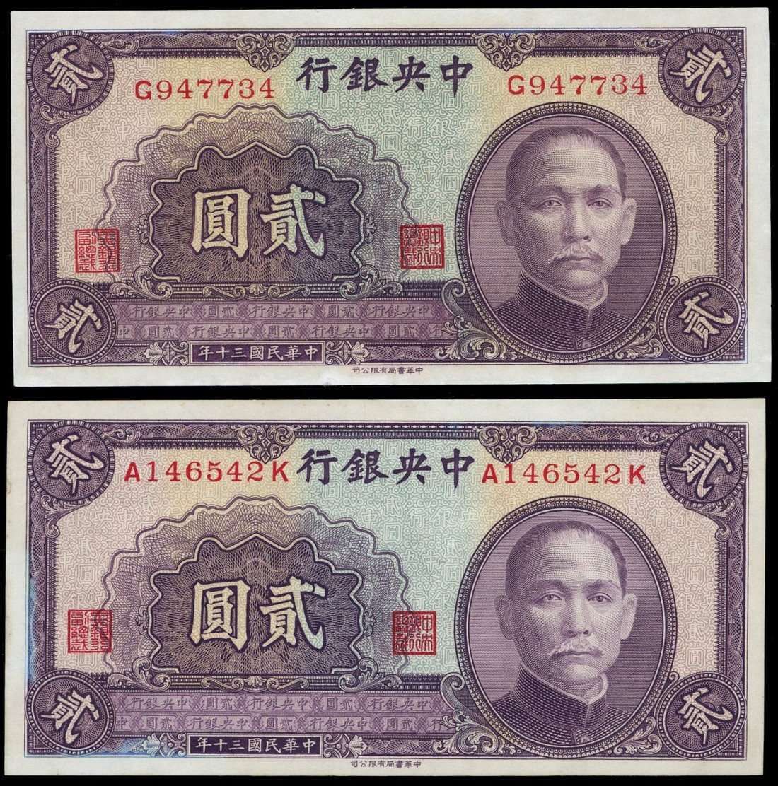 民國三十年(1941)中央銀行貳圓一對,編號A146542K及G947734,UNC,微黃,輕微處理痕跡