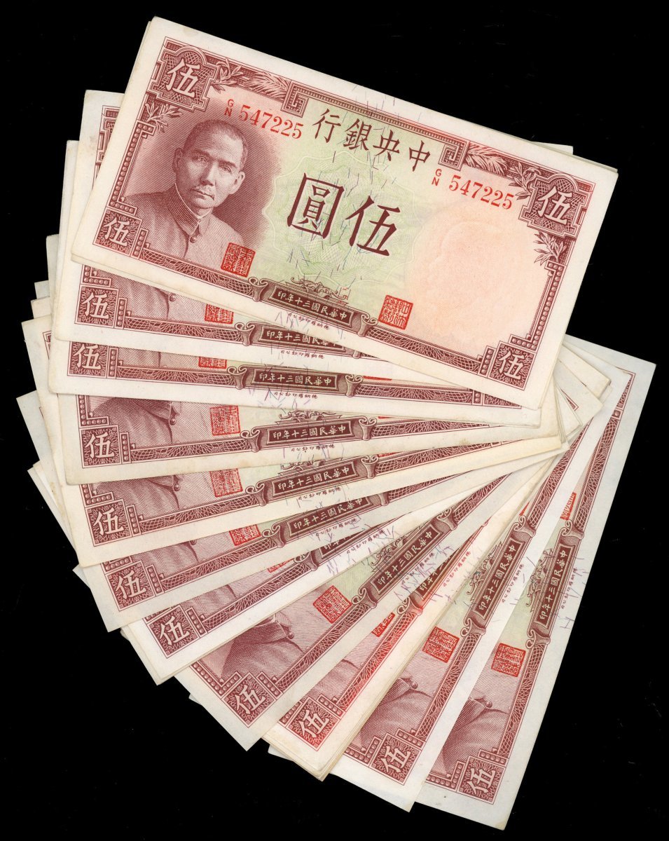 民國三十年(1941)中央銀行伍圓一組23枚,近乎UNC品相,輕微處理痕跡,帶微黃