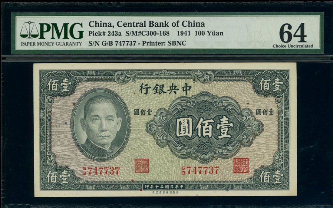 The Central Bank of China, 100 Yuan, 1941, serial number G/B 747737, (Pick 243a), PMG 64 Choice Uncirculated