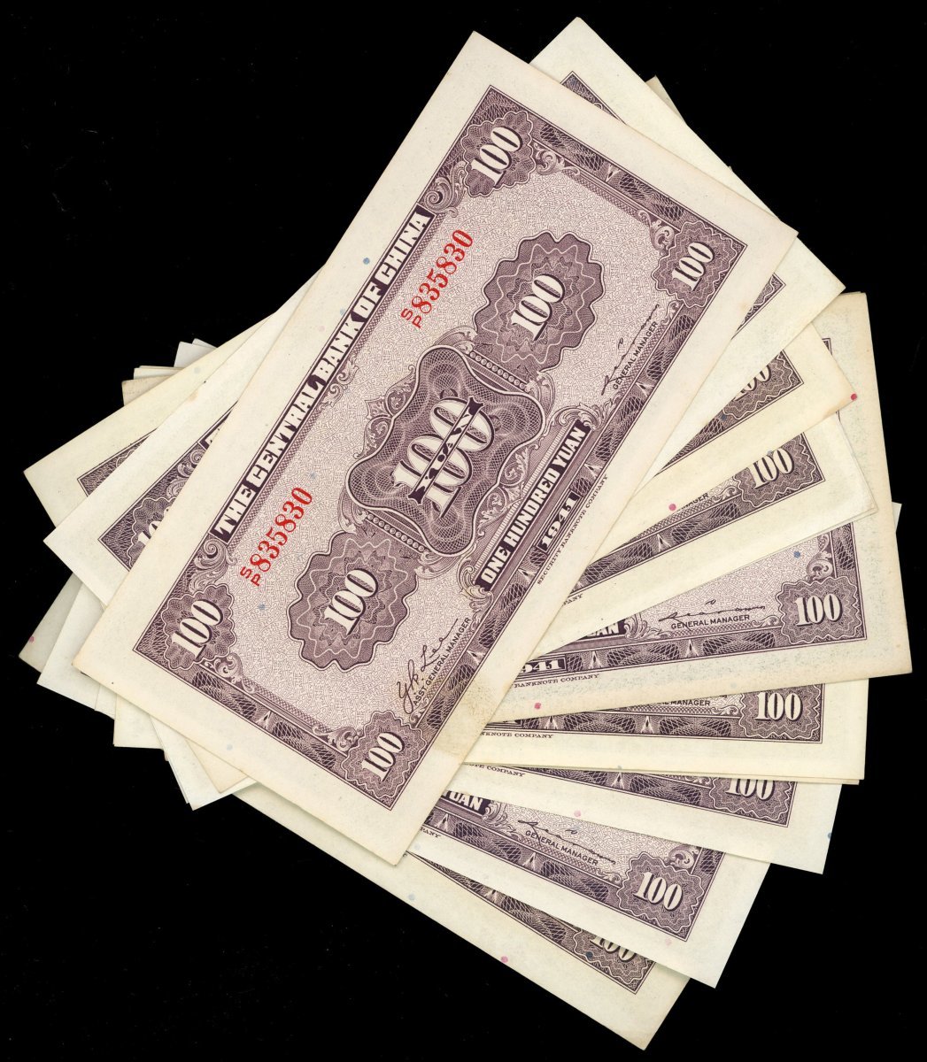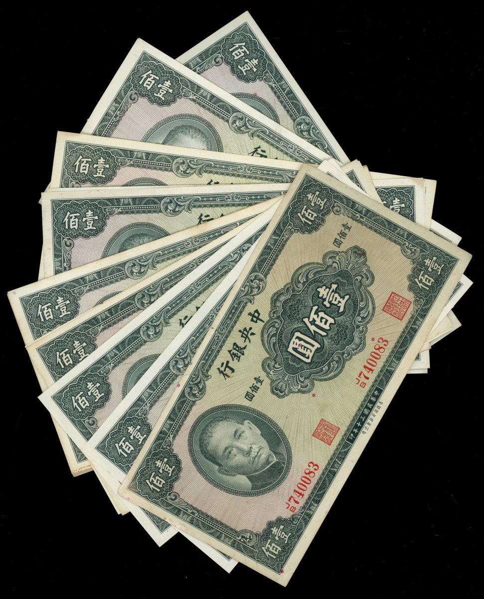 1941年中央銀行壹百圓一組12枚,UNC,若干連號,輕微處理痕跡,帶黃