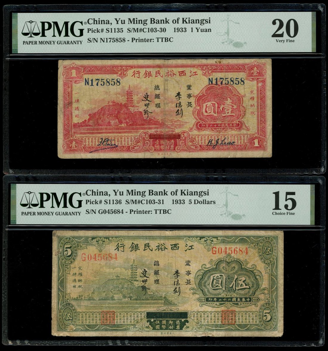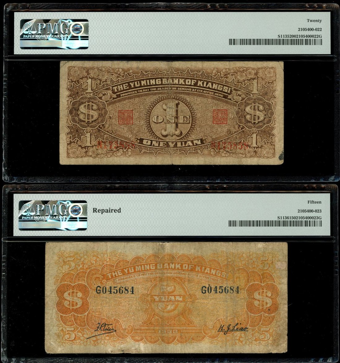 Yu Ming Bank of Kiangsi, a pair of 1 Yuan and 5 Yuan, 1933, serial numbers N175858 and G045684, (Pick S1135, S1136), graded PMG 20 and 15 (Repaired) (2)