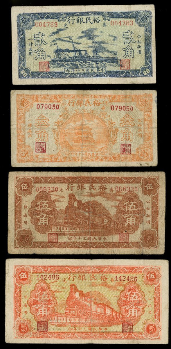 民國三十年(1941)壽光裕民銀行輔幣4枚一組,包括貳角,編號004783,叁角,編號079050,及伍角2枚,編號066330及142486,AF至F