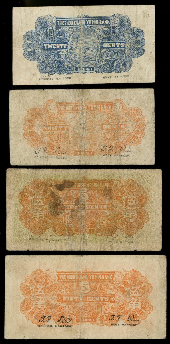 The Shoukuang Yumin Bank, selection of 4 fractional notes all dated 1941, 2 jiao #004783, 3 jiao #079050 and 5 jiao, brown #066330 and orange #142486,