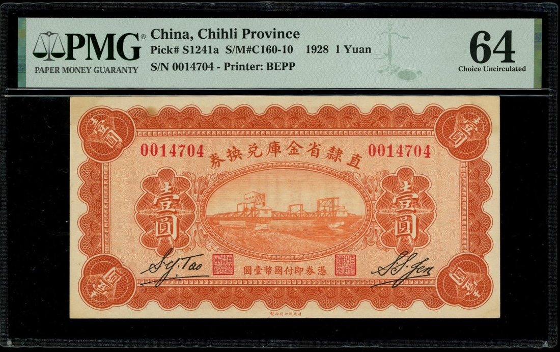 Chihli Province, 1 yuan, Year 17(1928), serial number 0014704, (Pick S1241a), PMG 64 Choice Uncirculated (Minor Stains, Pinhole).