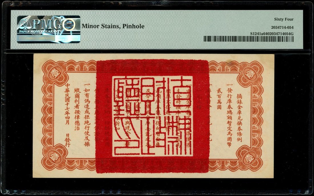 民國十七年(1928)直隸省金庫兌換券壹圓,編號0014704,PMG 64,有輕微鏽漬及細孔