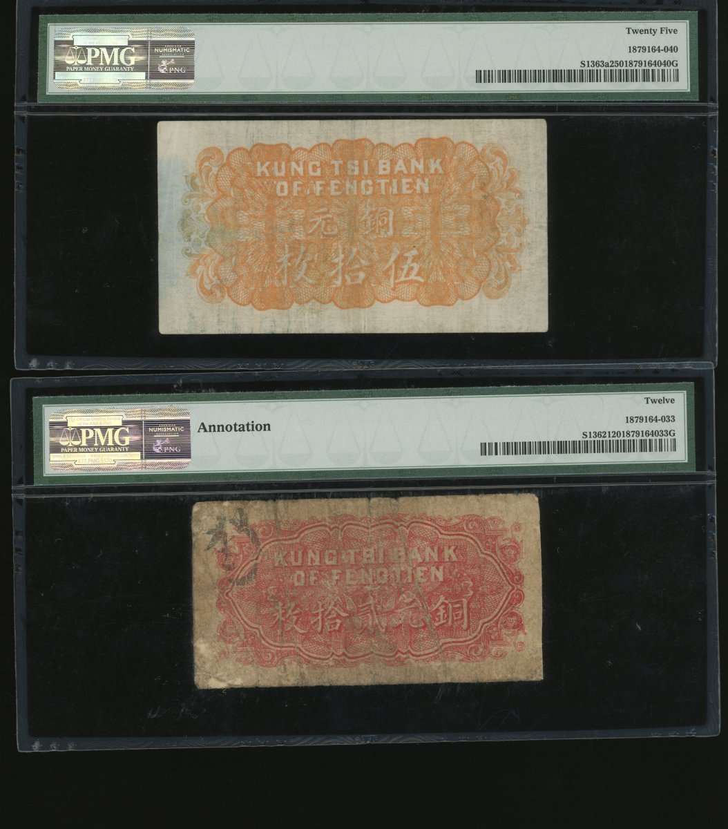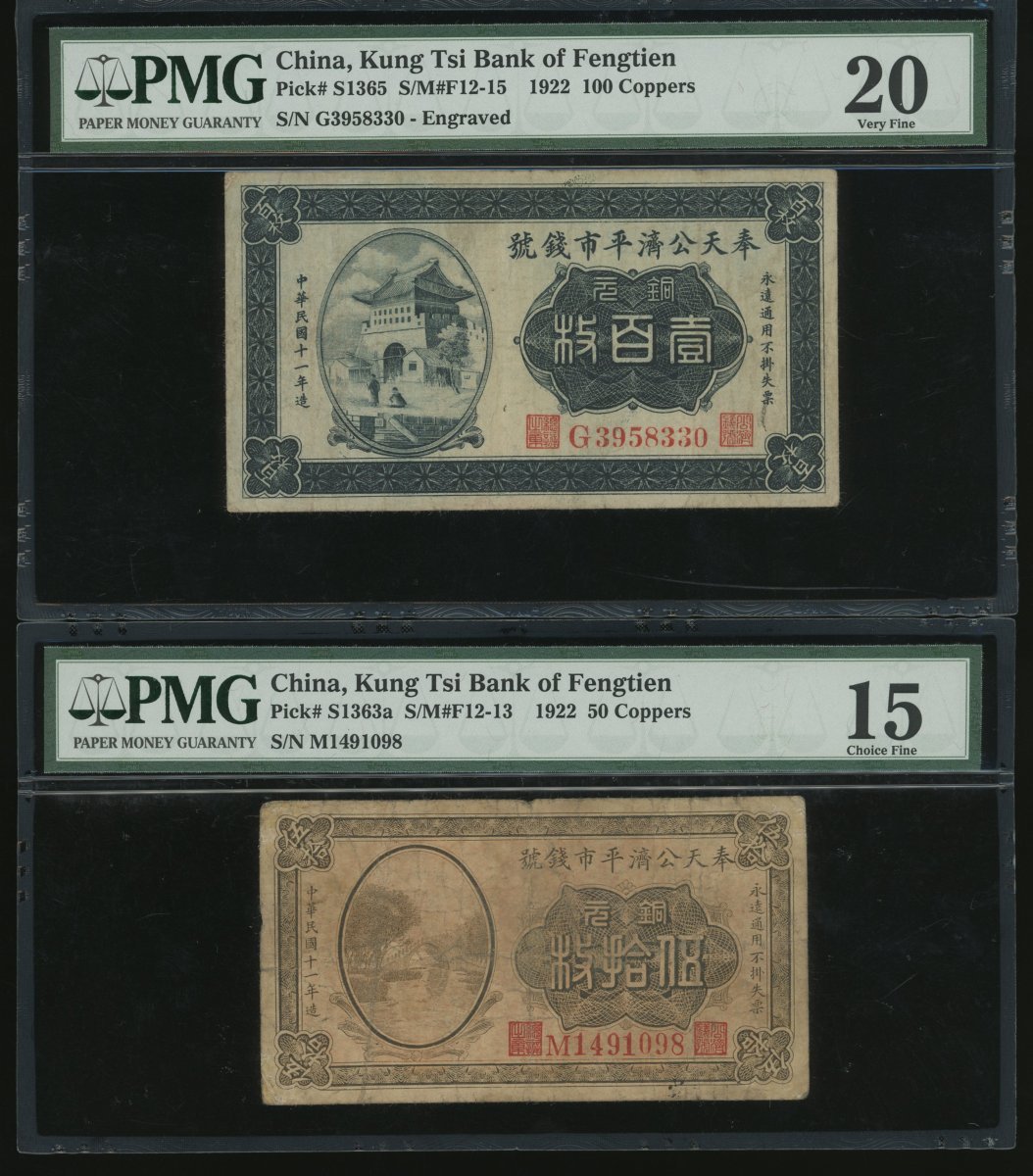Kung Tsi Bank of Fengtien, a group of 4x notes, 20, 50(2) and 100 coppers, Year 11(1922), serial numbers C5864595, M4681540, M1491098 and G3958330, (Pick S1362, S1363a and S1365), graded PMG 12(Annotation), 25, 15 and 20 respectively (4).