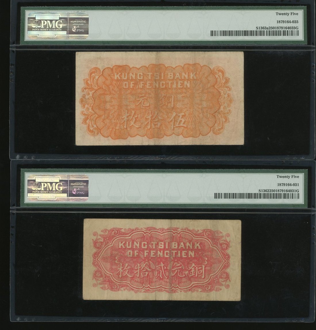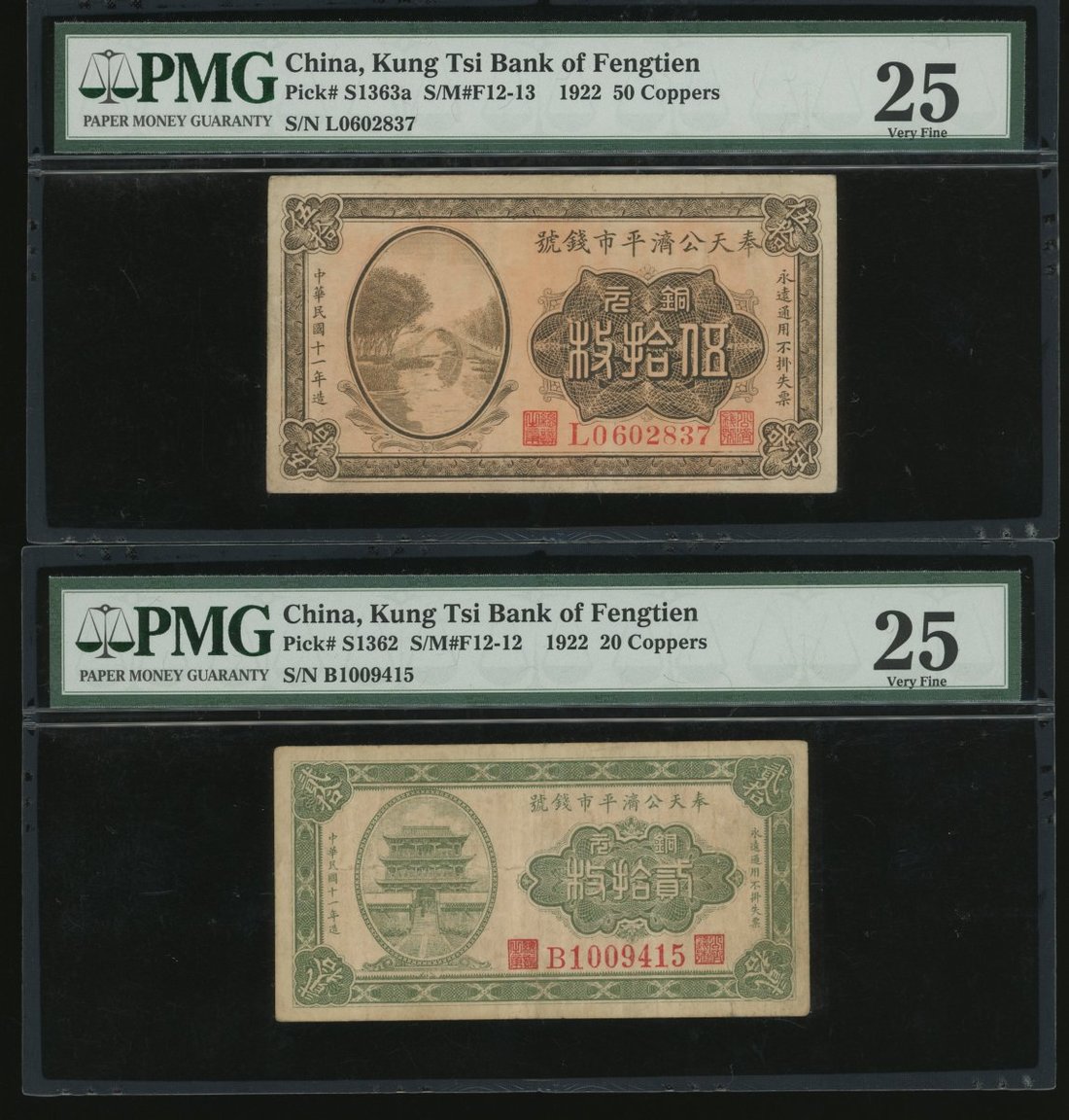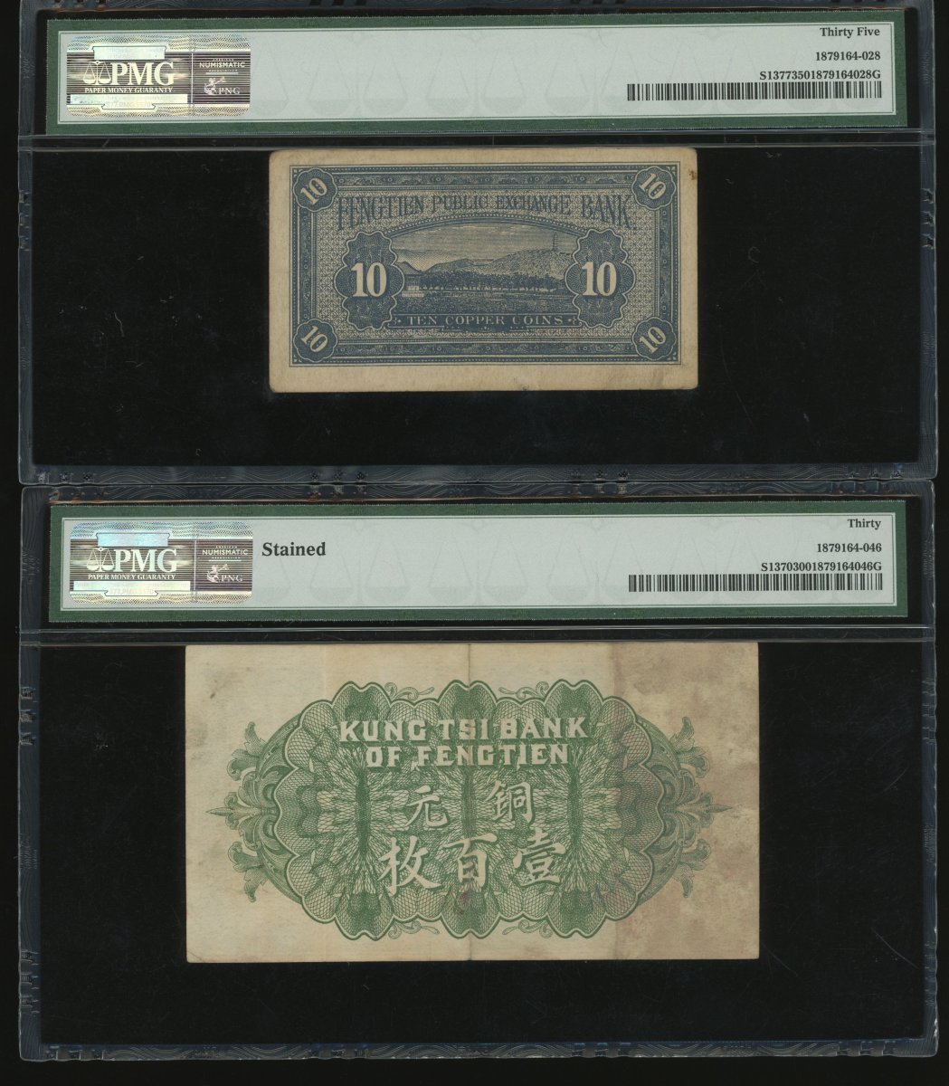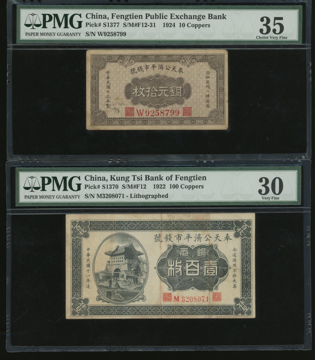 Fengtien Public Exchange Bank, a group of 4x notes, 10, Year 13(1924), 20, 50 and 100 coppers, Year 11(1922), serial numbers W9258799, B1009415, L0602837 and M3208071, (Pick S1377, S1362, S1363a and S1370), graded PMG 35, 25, 25 and 30(Stained) respectively (4).