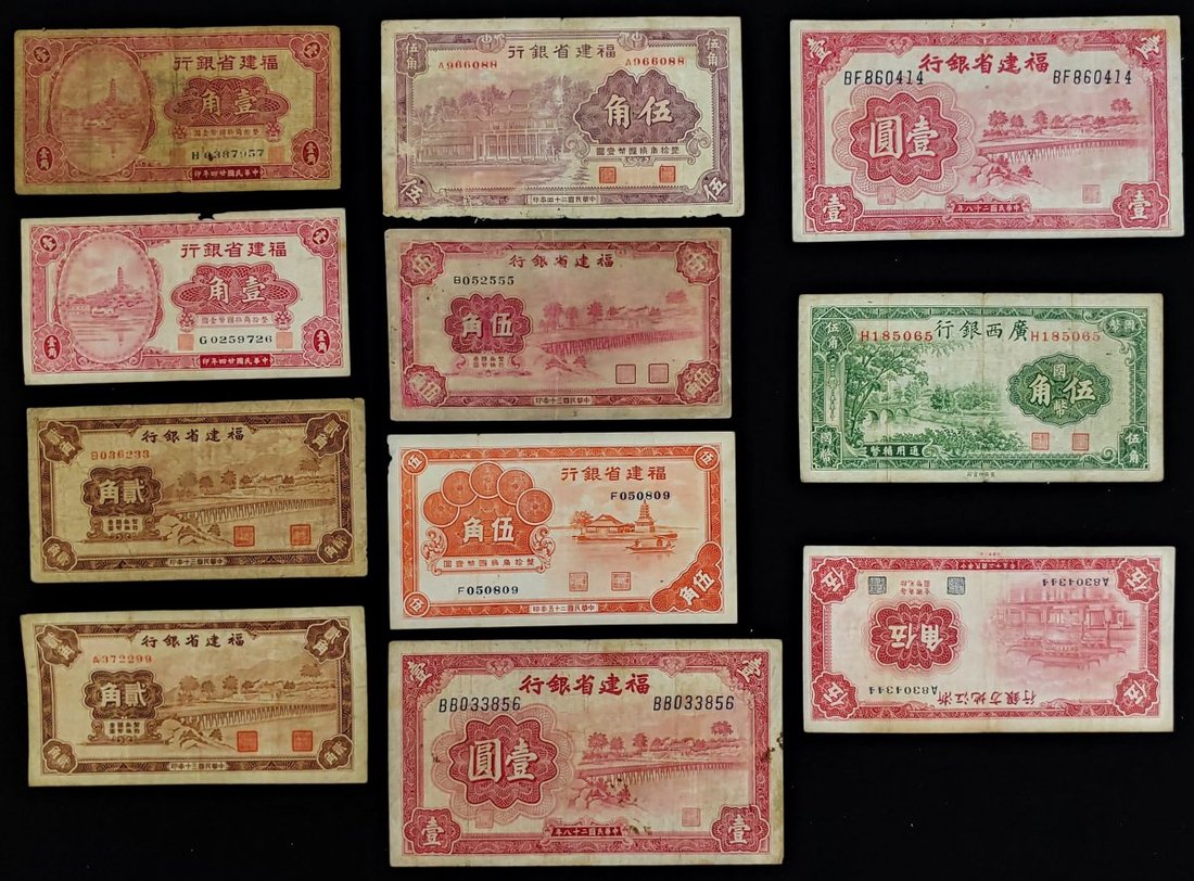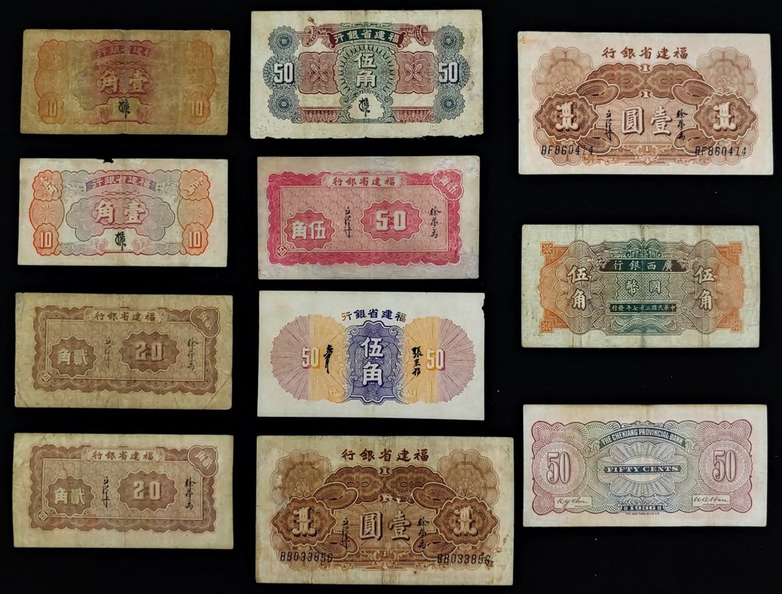 Fukien Provincial Bank, group of 9 notes, 1930's, from 1 jiao to 1 yuan, different types, also Provincial Bank of Kwangsi, 5 chiao, 1938 and Chekiang Provincial Bank, 5 chiao, 1936,