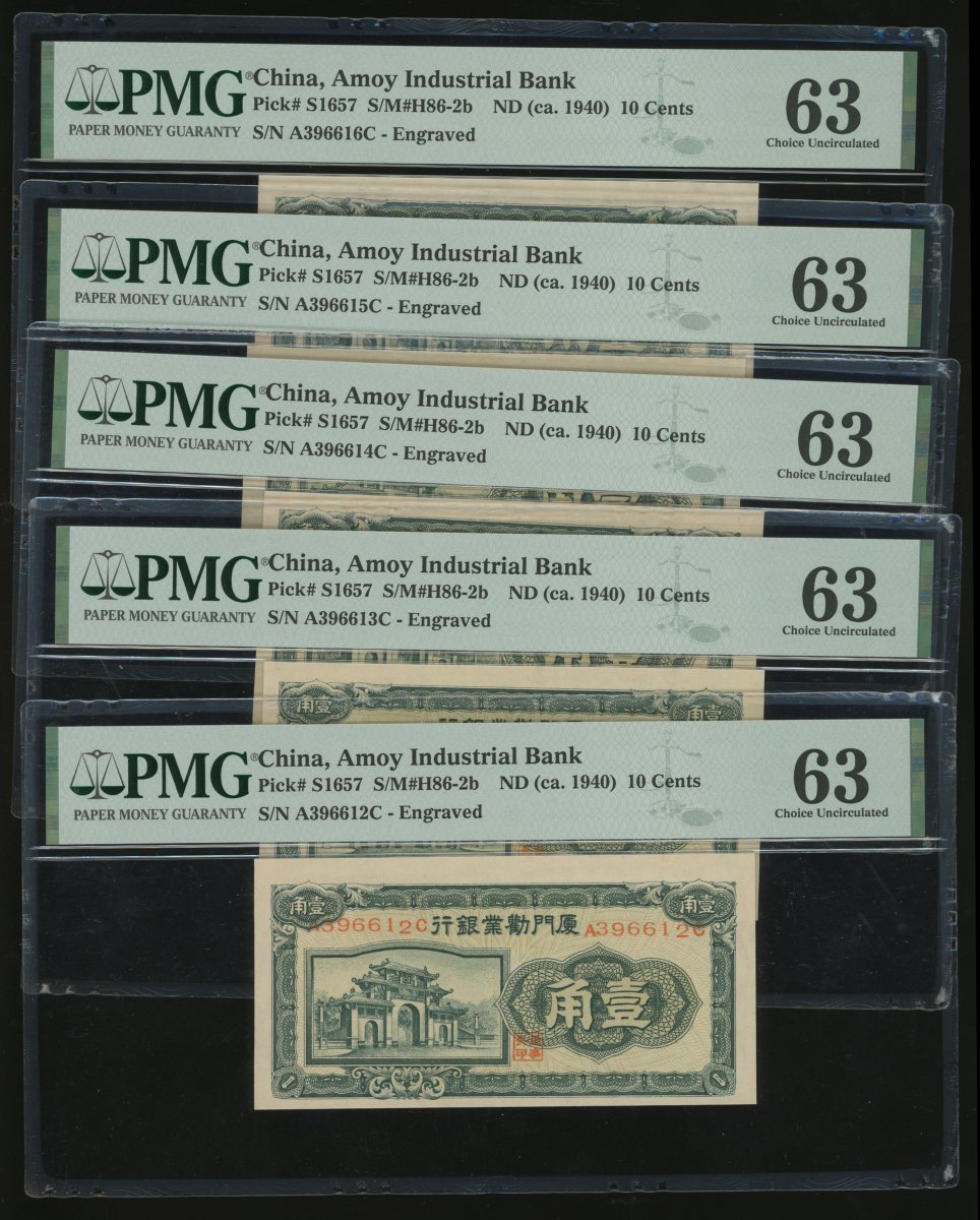 廈門勤業銀行一組10枚,包括壹角連號5枚,#A396612C-616C,及貳角連號5枚,#A022111B-115B,壹角均評PMG 63,貳角評63至 66EPQ