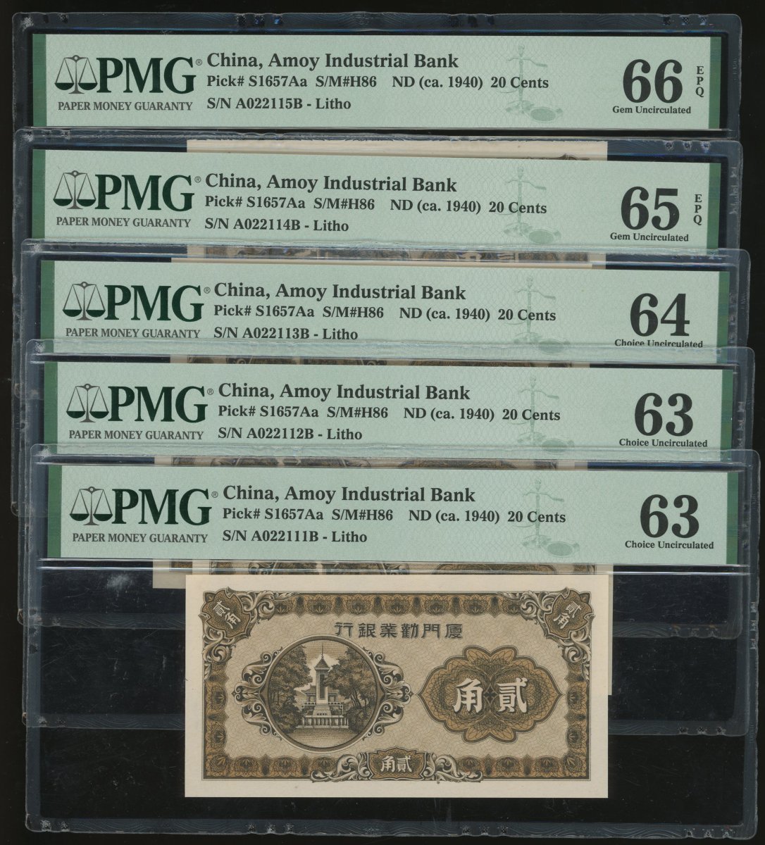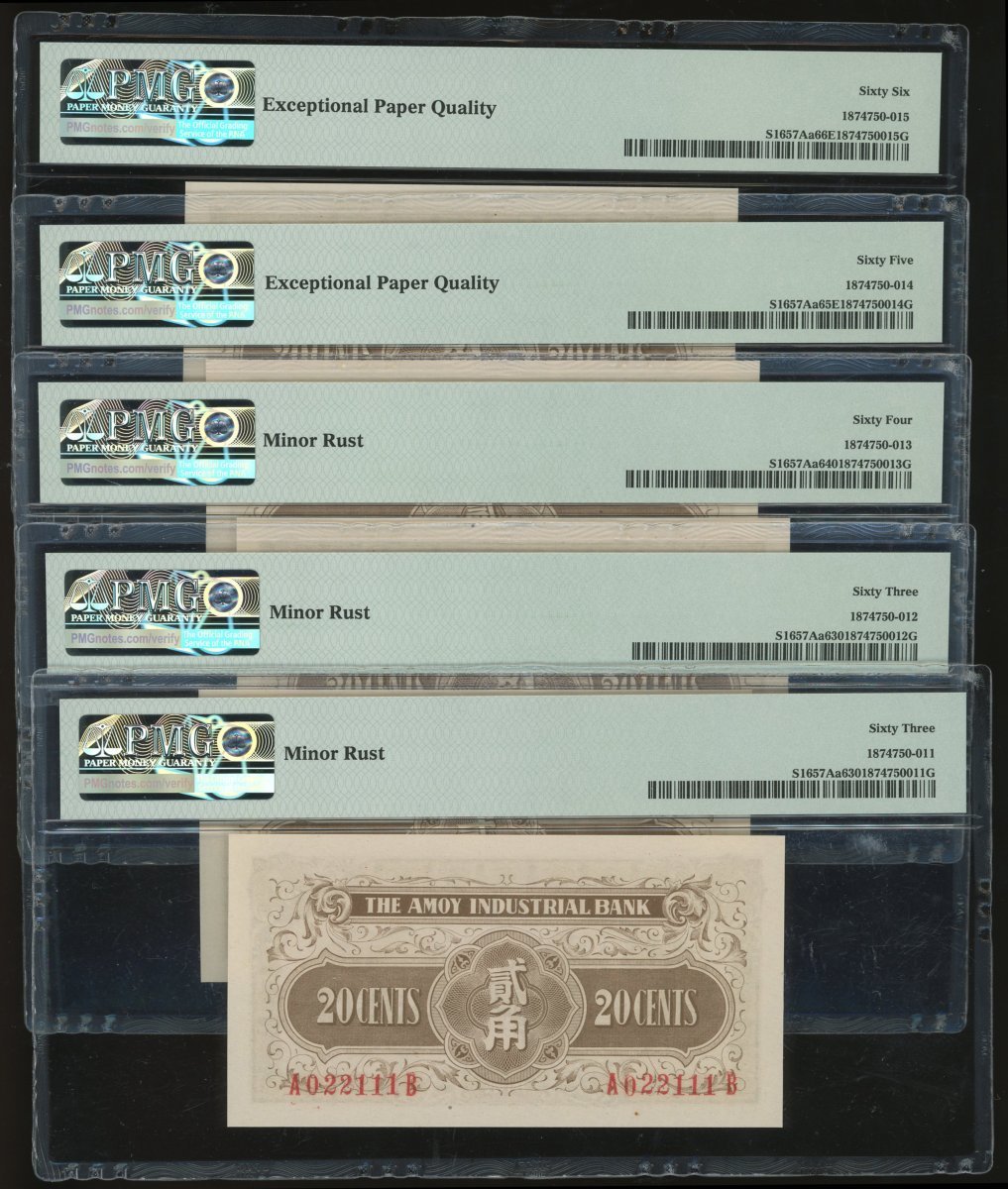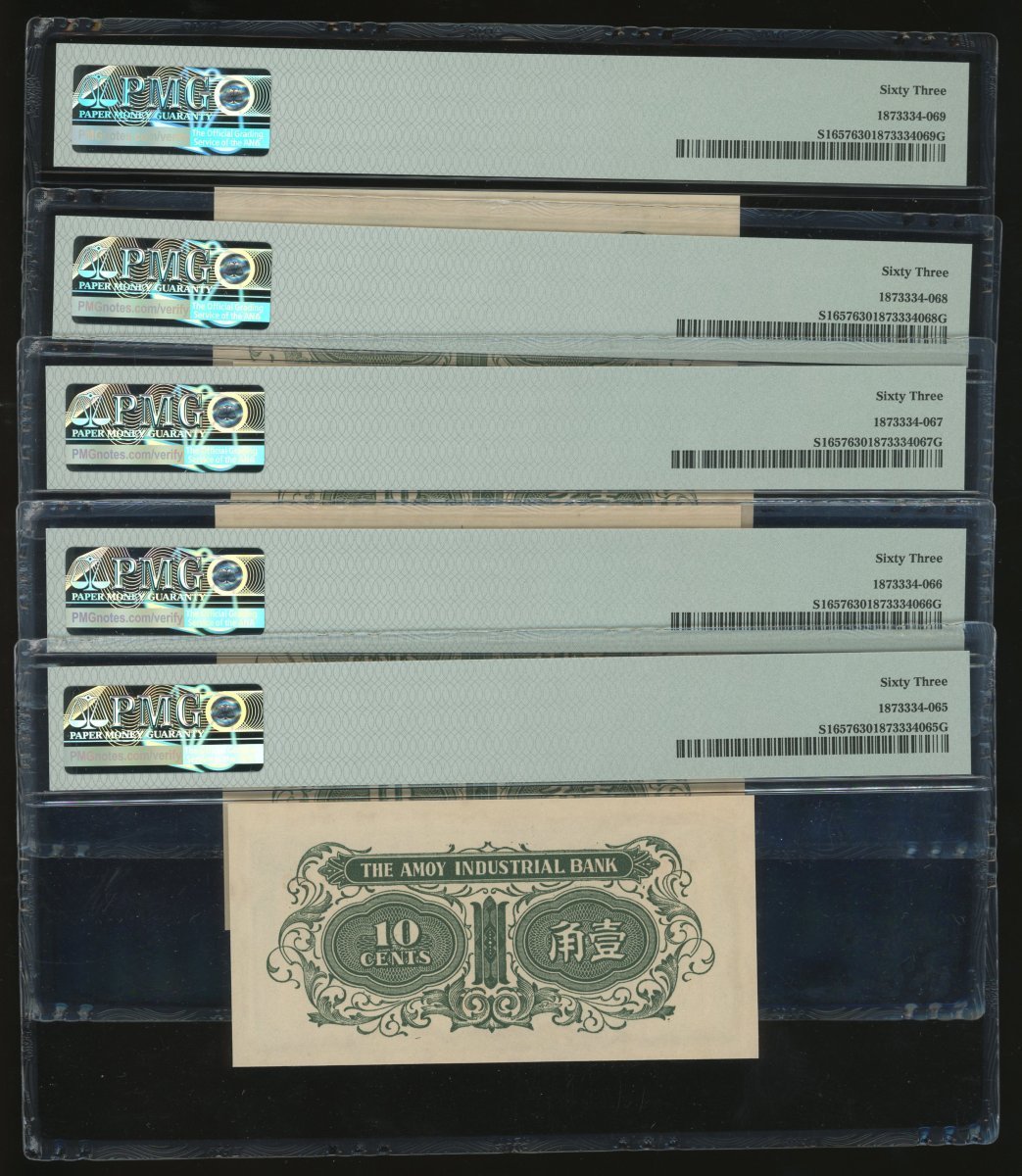 Amoy Industrial Bank, group of 5x 1 jiao, #A396612C-616C and 5x 2 jiao, #A022111B-115B, (Pick S1657 and 1657Aa), the 1 jiao all graded PMG 63, the 2 jiao,63 to 66EPQ (10)