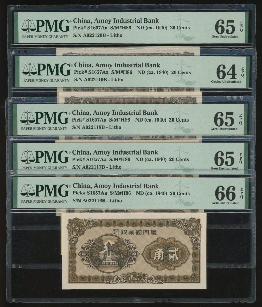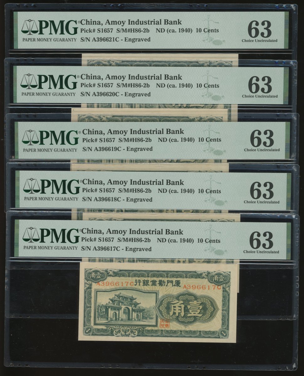 廈門勤業銀行一組10枚,包括壹角連號5枚,A396617C-621C,及貳角連號5枚,A022116B-120B,壹角均評PMG 63,貳角評64至 66EPQ