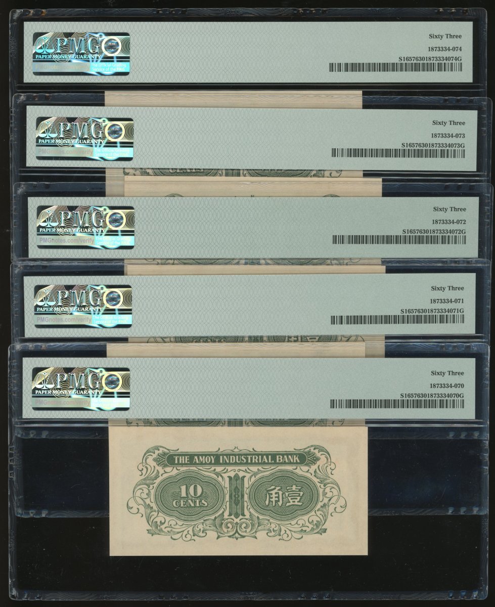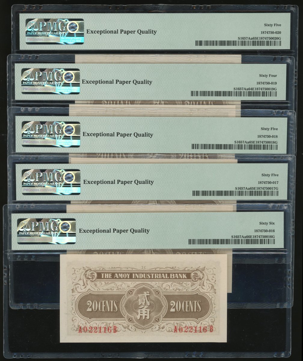 Amoy Industrial Bank, group of 5x 1 jiao, #A396617C-621C and 5x 2 jiao, #A022116B-120B, (Pick S1657 and 1657Aa), the 1 jiao all graded PMG 63, the 2 jiao,64EPQ to 66EPQ (10)
