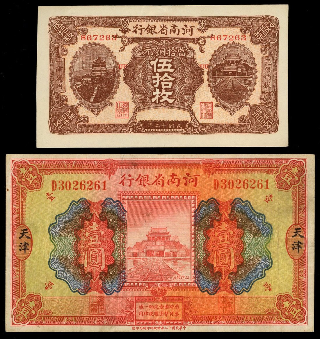 河南省銀行紙幣2枚一組,包括民國十二年(1923)伍拾枚,編號867263及民國十二年(1923)壹圓,天津地名,編號D3026261,分別AU及EF