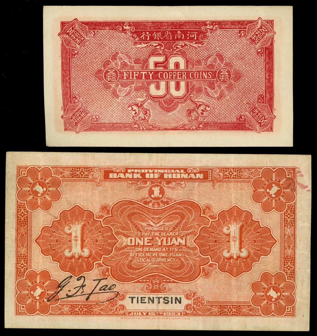 Provincial Bank of Honan, lot of 2 notes, 50 coppers, 1923 #867263 and 1 yuan, Tientsin, 1923 #D3026261,