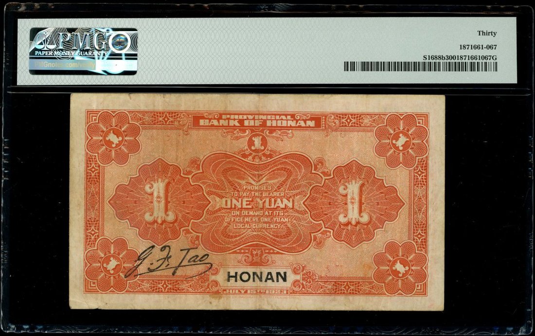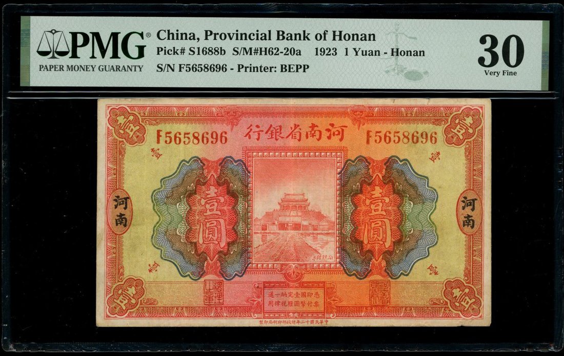 Provincial Bank of Honan, 1 yuan, Honan, Year 12(1923), serial number F5658696, printed by BEPP,