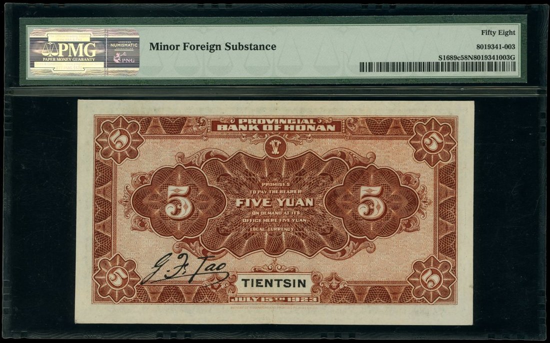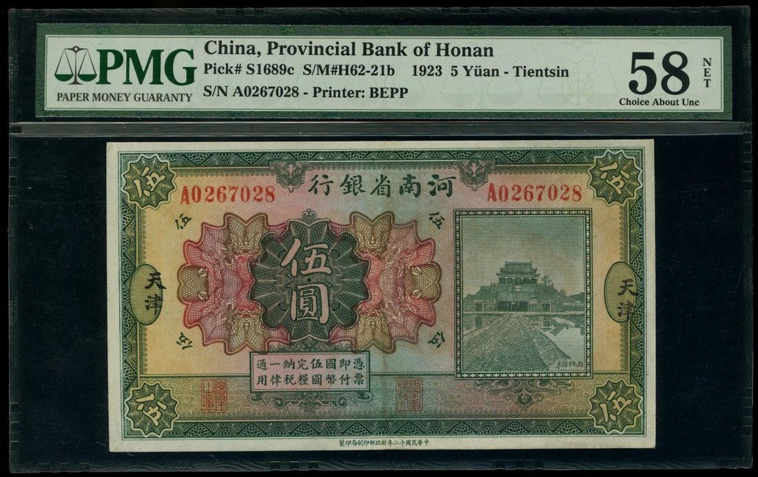 Provincial Bank of Honan, 5 yuan, Tientsin, 1923, serial number A0267028, (Pick S1689c), PMG 58NET (Minor Foreign Substance) Choice About Uncirculated.