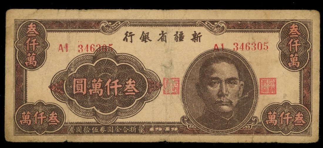 Sinkiang Provincial Bank, a group of 3 notes, consists of 6 million yuan, 30 million yuan and 60 million yuan, 1948, serial numbers AB469711, AI346305 and AM141917, (Pick S1788), good fine to about very fine, with foxing or folds (3).