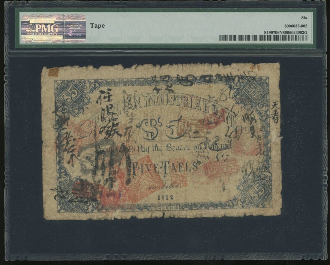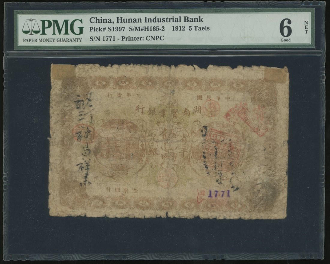 Hunan Industrial Bank, 5 teals, 1912, serial number 1771, (Pick S1997), PMG 6NET Good (Tape), the only note in the PMG population report.