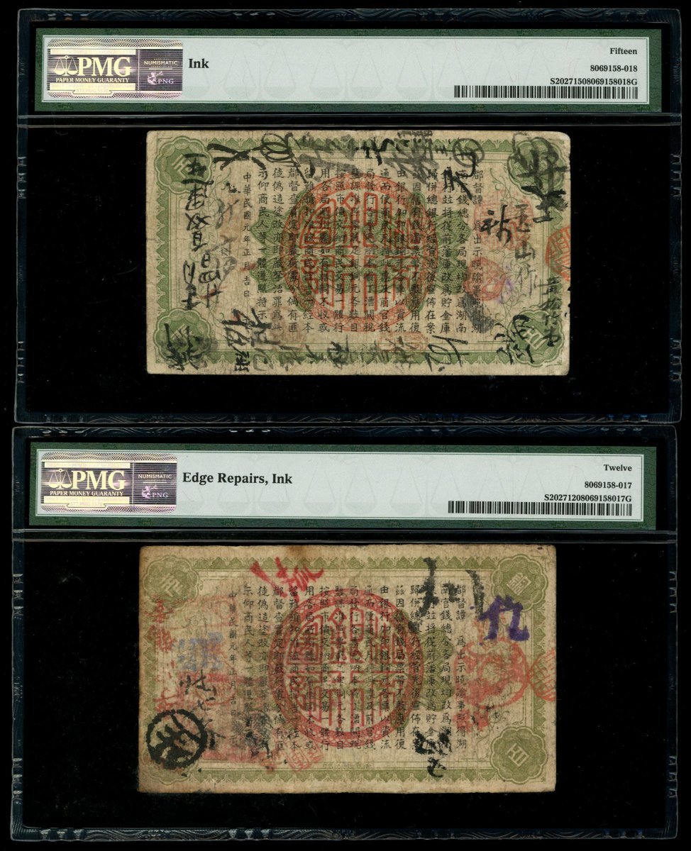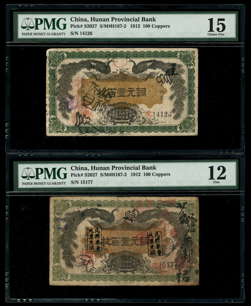 民國元年(1912)湖南銀行銅元壹百枚一對,編號14126及15177,分別評PMG 15 (有墨)及12 (紙邊有修補,有墨)