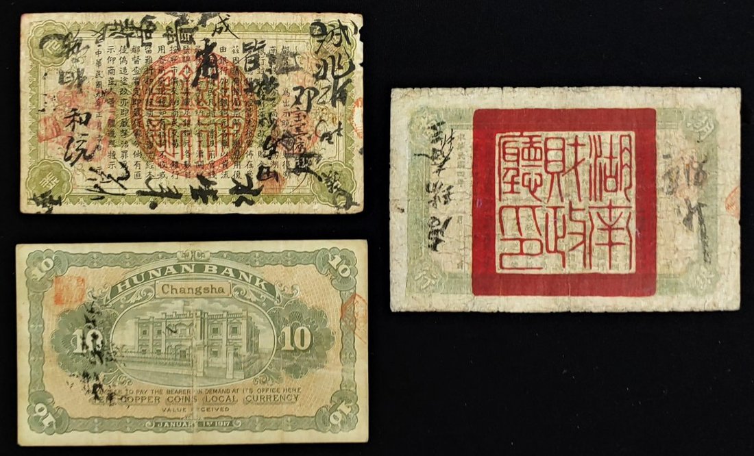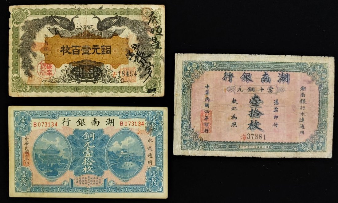 Hunan Bank, lot of 3 notes: 100 coppers, 1912, 10 coppers, 1915 and 1916,