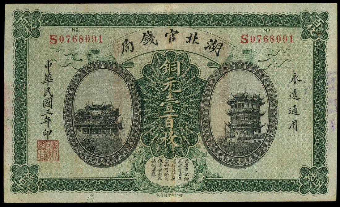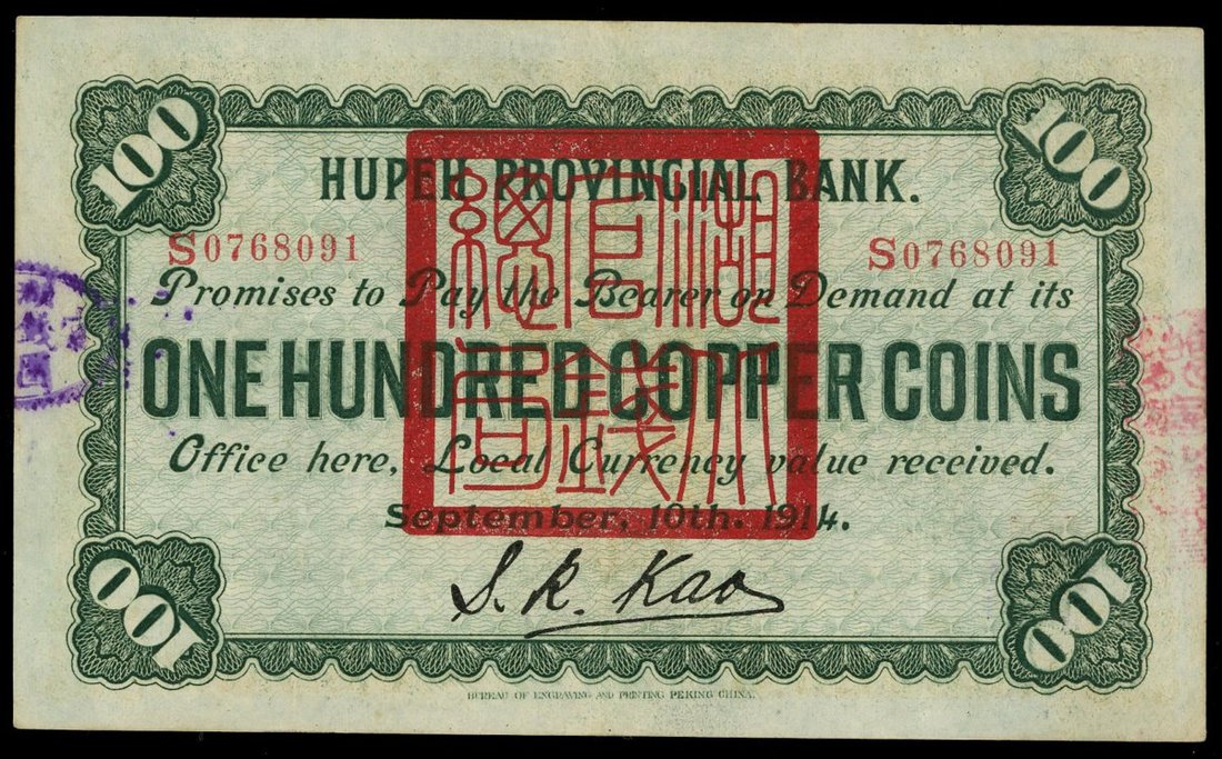 Hupeh Provincial Bank, 100 coppers, 1914, serial number S0768091, (Pick S2098), extremely fine to about uncirculated