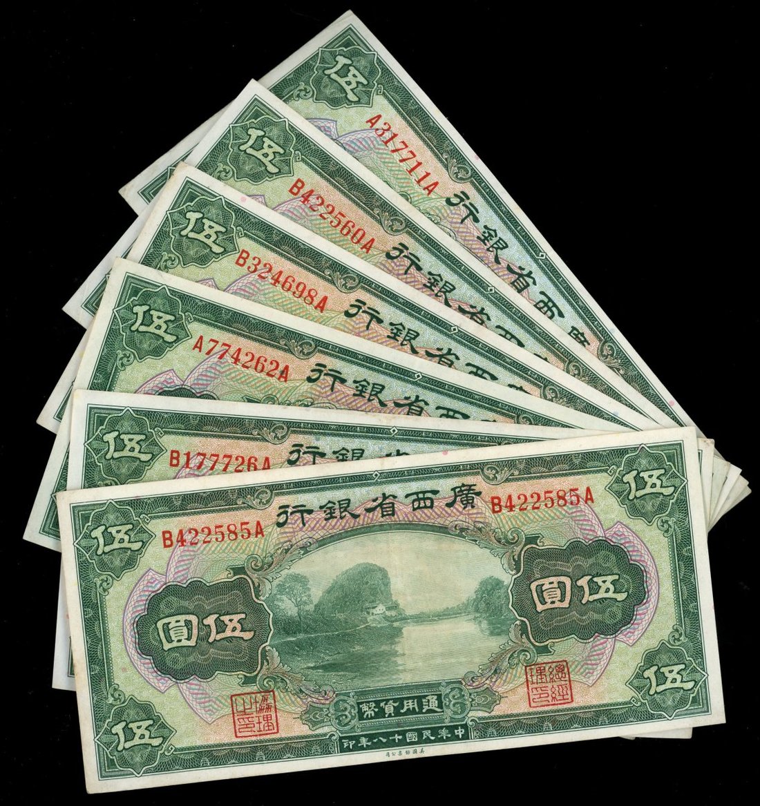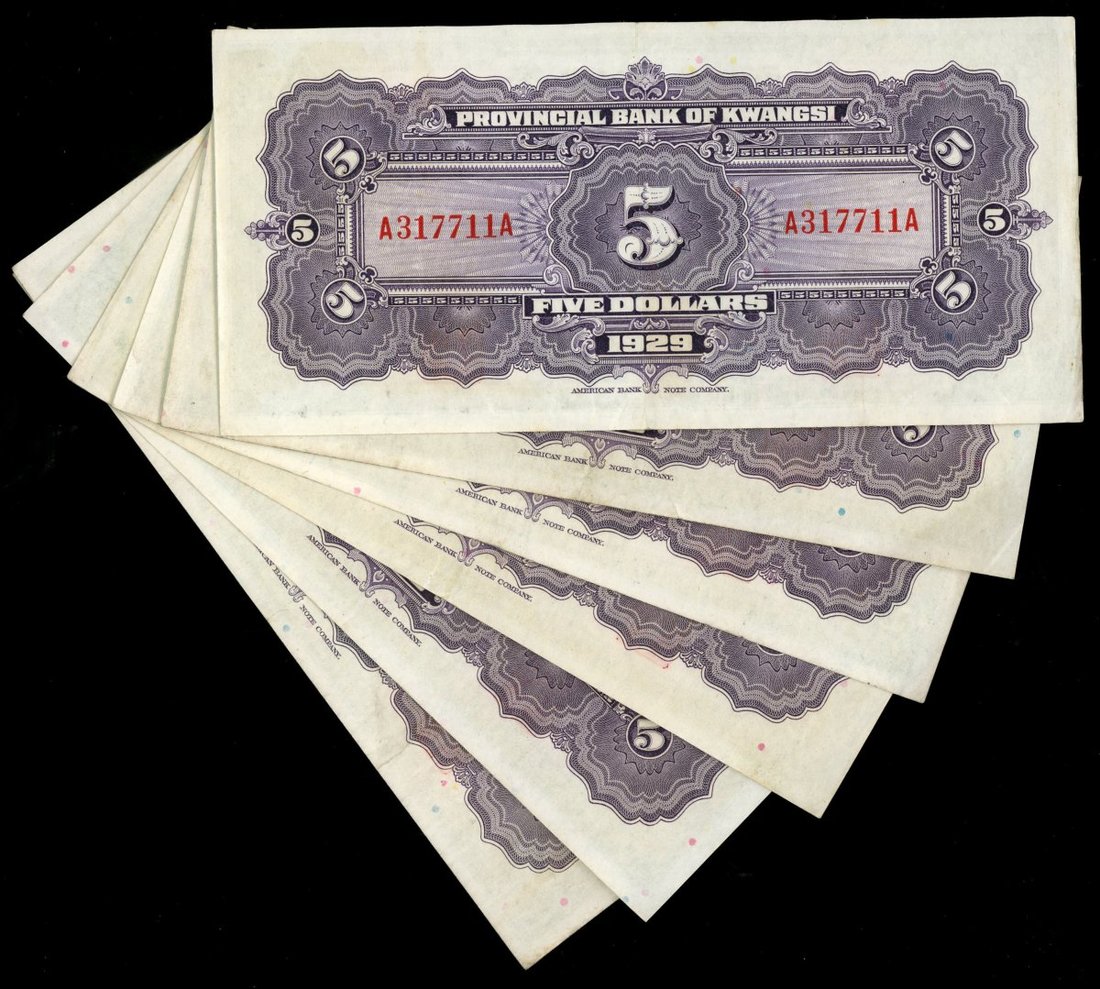 Provincial Bank of Kwangsi, group of 7x 5 yuan, without place name, 1929, very fine or better (7)