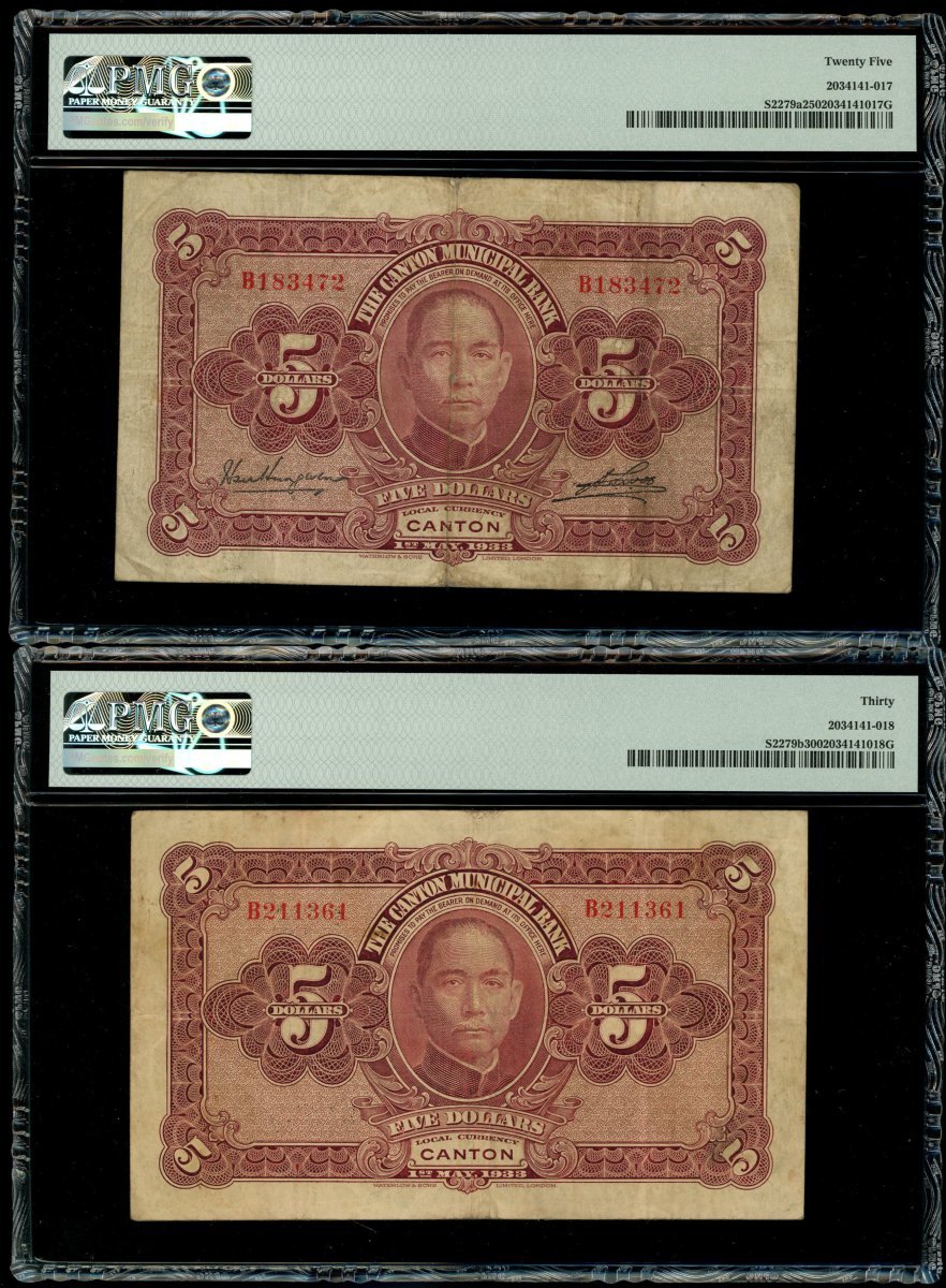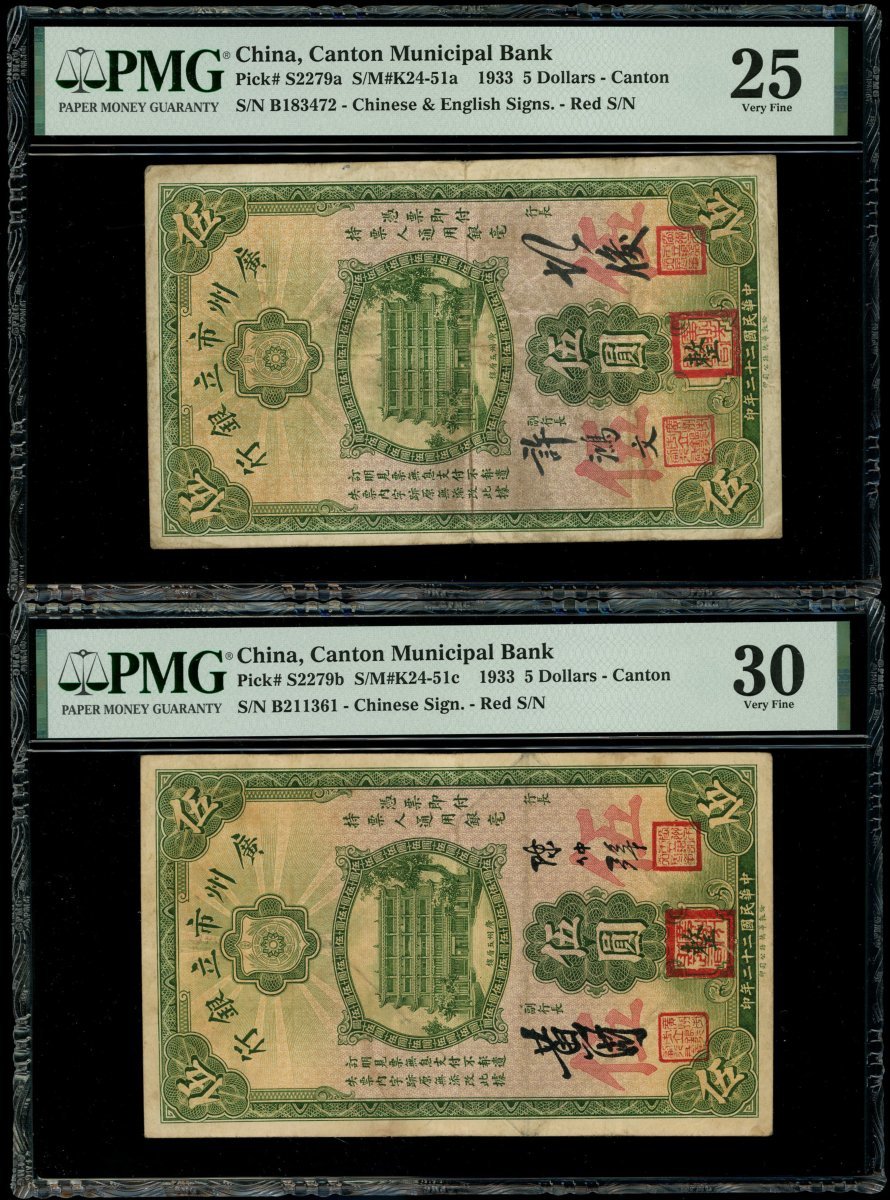 民國二十二年(1933)廣州市立銀行伍圓2枚,編號B183472及B211361,兩款署名樣式,分別評PMG 25及30