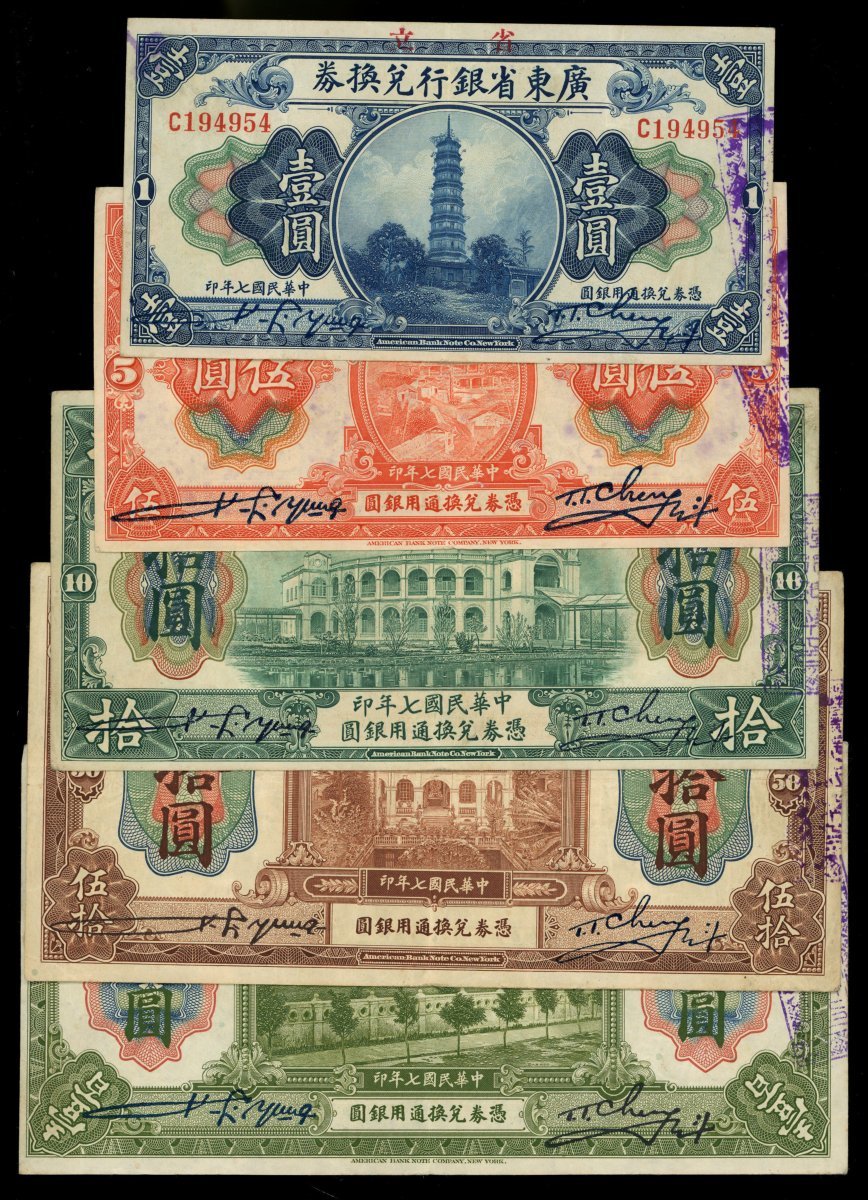 民國七年(1918)廣東省銀行兌換券5枚一組,包括1,5,10,50及100元,編號C194954,911397,007528,164037及047607,EF至UNC,有黃