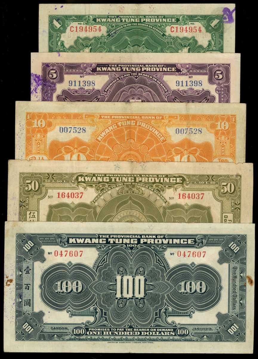The Provincial Bank of Kwang Tung Province, a group of 5x notes, consists of $1, $5, $10, $50 and $100, 1918, serial numbers C194954, 911397,007528, 164037 and 047607, (various picks), extremely fine to uncirculated with foxing (5).
