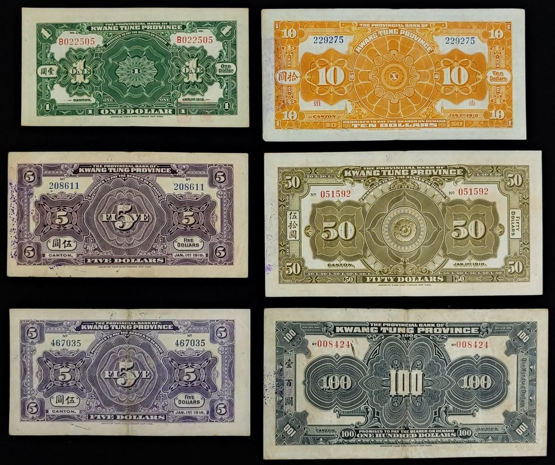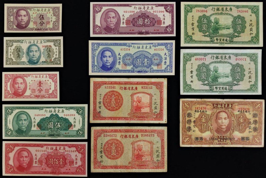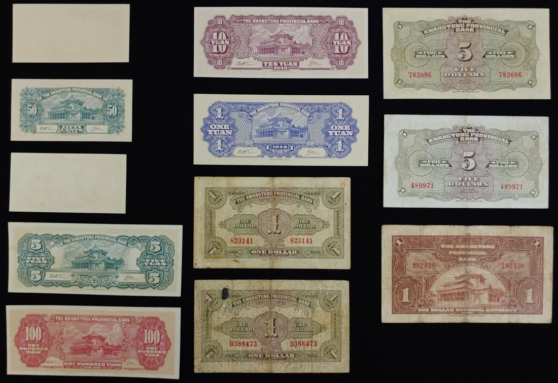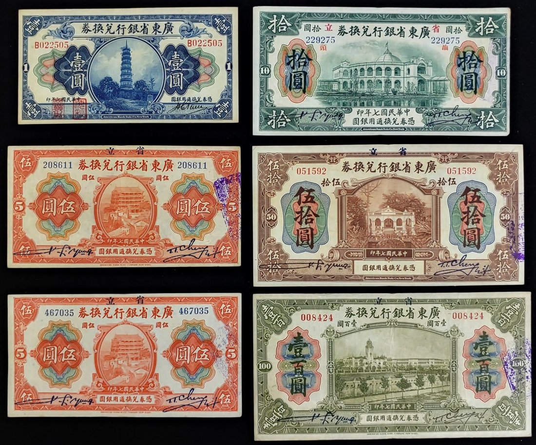 Kwangtung Provincial Bank/Canton Municipal Bank, group of 26 notes, 1918 to 1933, better types include a set of the 1918 issue, 1 yuan 1o 100 yuan, the Canton Municipal Bank, 1 yuan, 1933, two different signatures, also 3 notes from the Central Bank of China, Mengchiang Bank, 5 chiao, a key note,