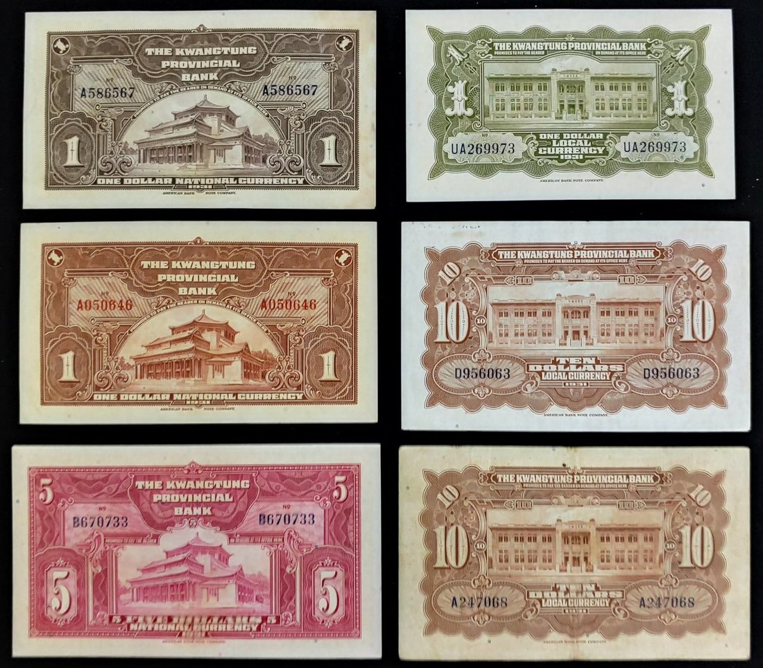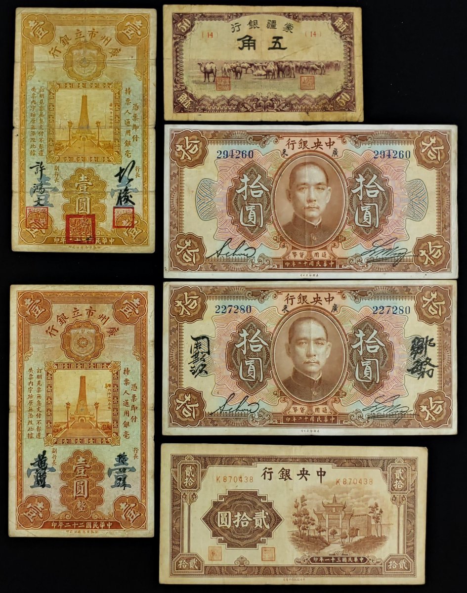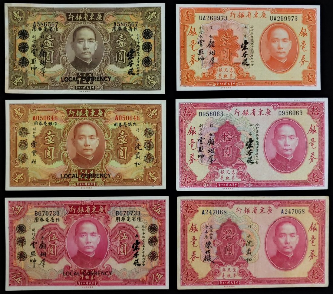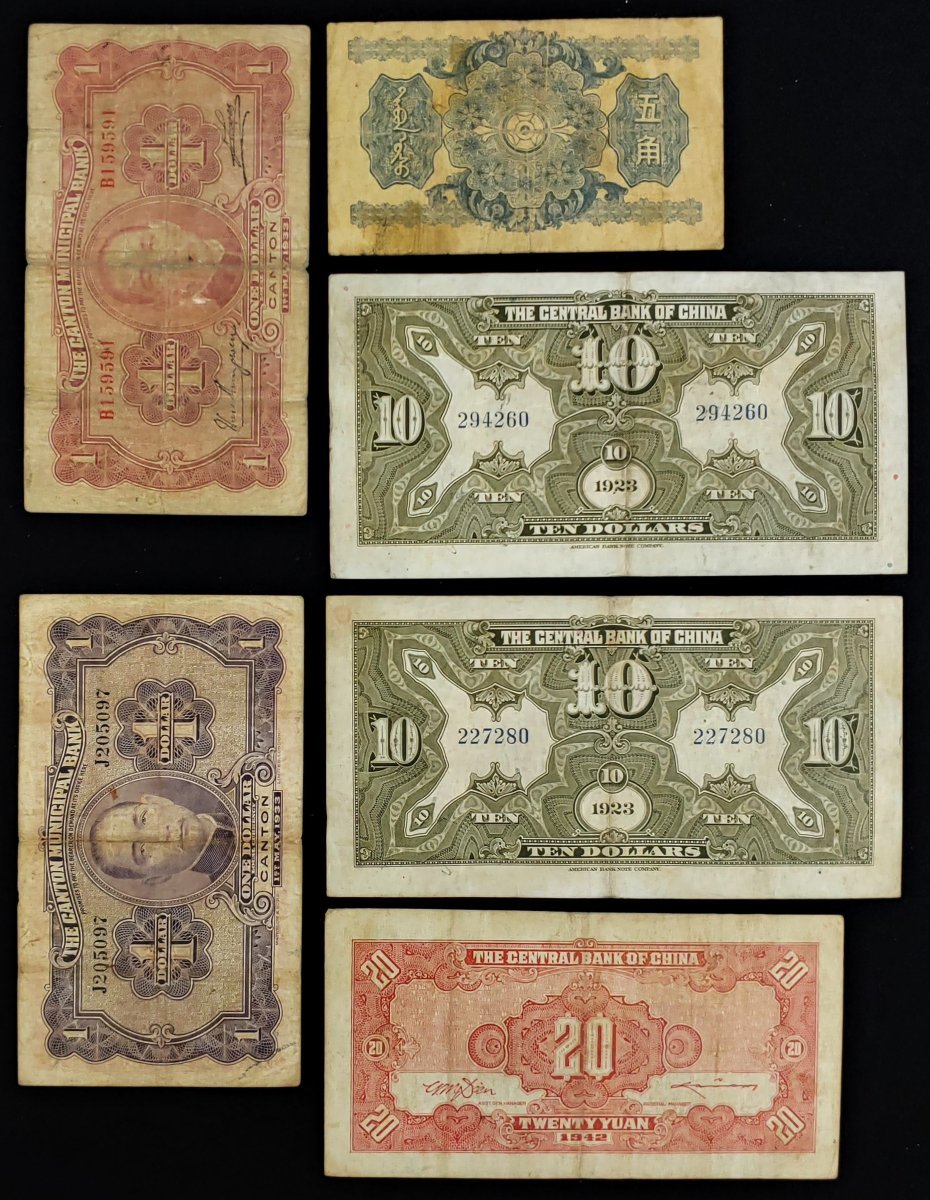 Kwangtung Provincial Bank/Canton Municipal Bank, group of 26 notes, 1918 to 1933, better types include a set of the 1918 issue, 1 yuan 1o 100 yuan, the Canton Municipal Bank, 1 yuan, 1933, two different signatures, also 3 notes from the Central Bank of China, Mengchiang Bank, 5 chiao, a key note,