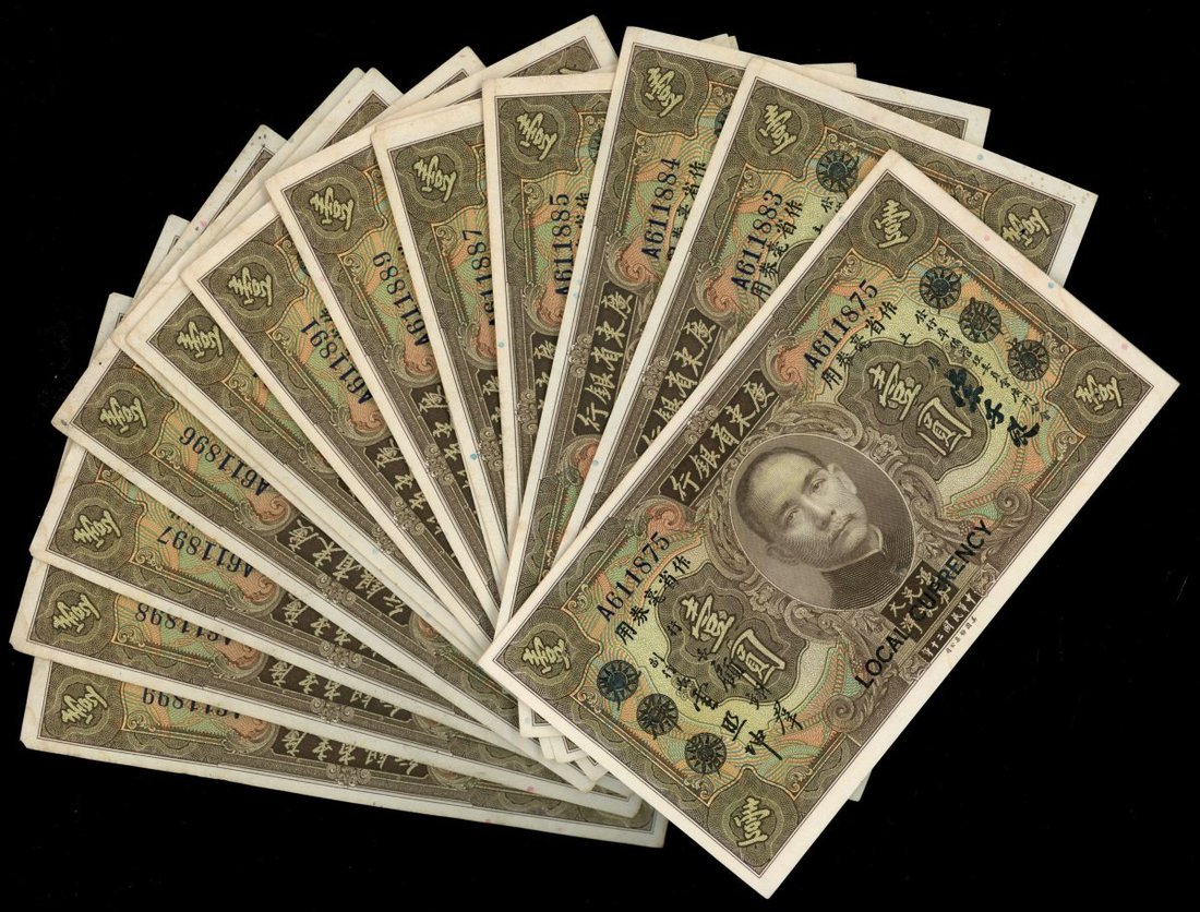 The Kwangtung Provincial Bank, a group of 20x $1 national currency, Year 20(1931), single letter prefix, several groups of consecutive serial numbers between A611875-899, overprint "LOCAL CURRENCY" on not issued National Currency note, printed ABNC,