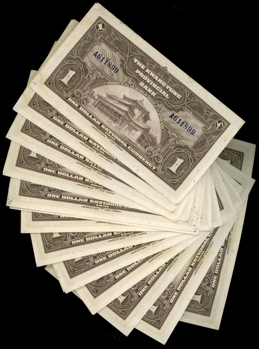 民國二十年(1931)廣東省銀行壹圓20枚,單字軌,編號範圍A611875-899,當中包括數組連號,AU,有釘孔