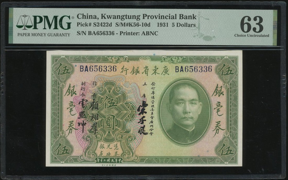 Kwangtung Provincial Bank, $5, 1931, serial number BA656336, (Pick S2422d), PMG 63 Choice Uncirculated