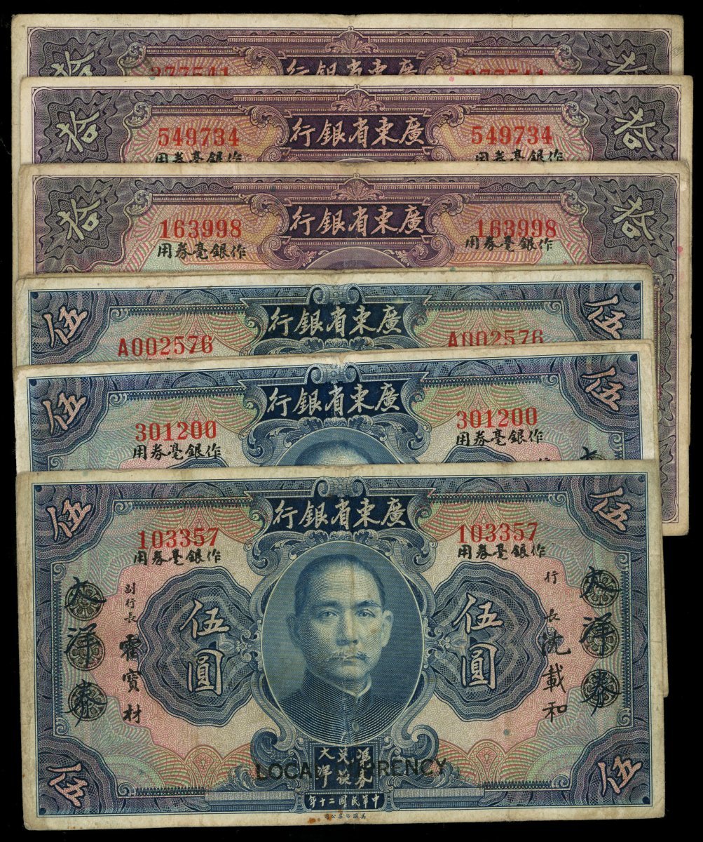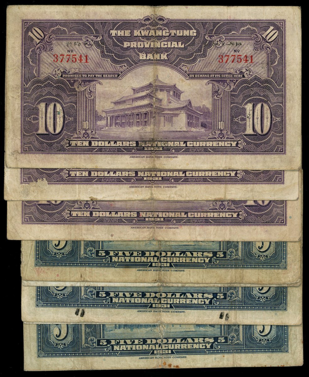 民國二十年(1931)廣東省銀行伍圓5枚及拾圓3枚,F或更好