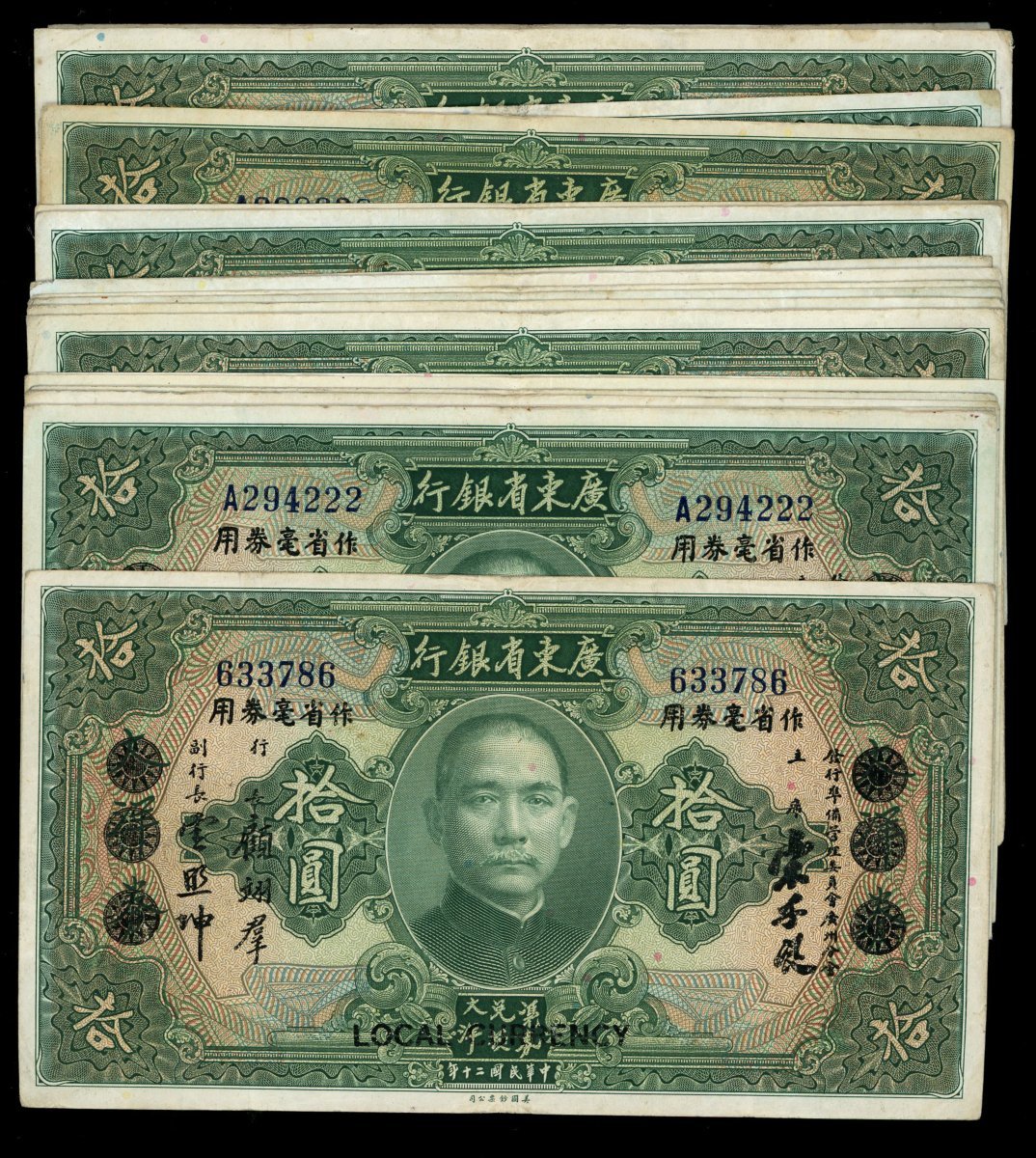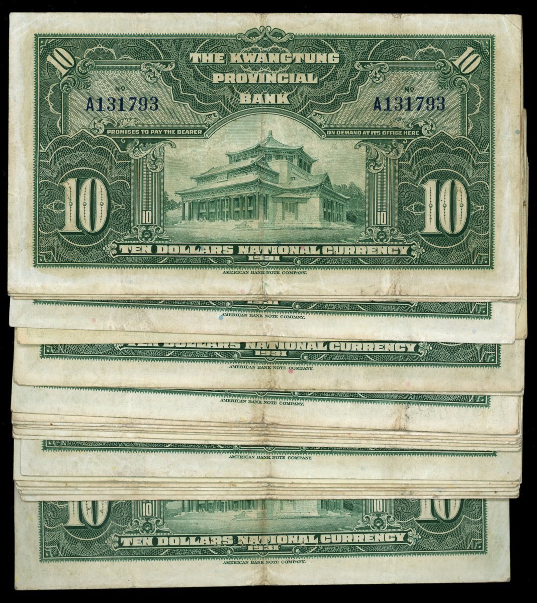 Provincial Bank of Kwangtung, group of 21x 10 yuan, 1931, green,
