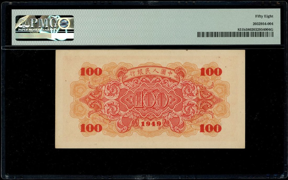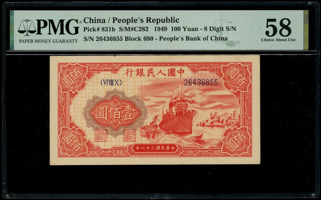 1949年中國人民銀行第一版人民幣100元「紅輪船」,編號VI VIII X 26436855,PMG 58