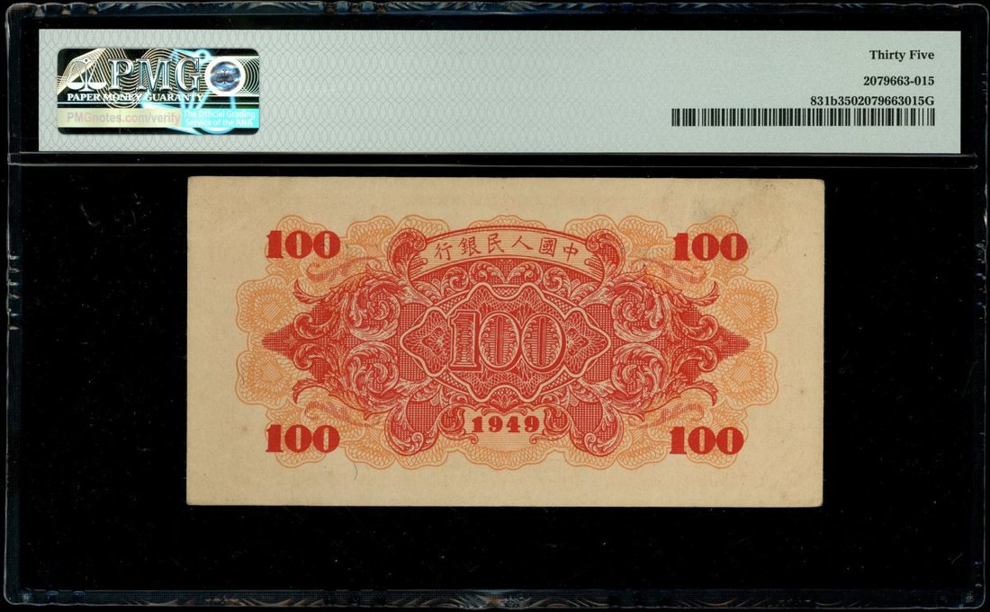 1949年中國人民銀行第一版人民幣100元「紅輪船」,編號X VIII VI51312456,PMG 35,膠套有彎,但不影響套內紙鈔