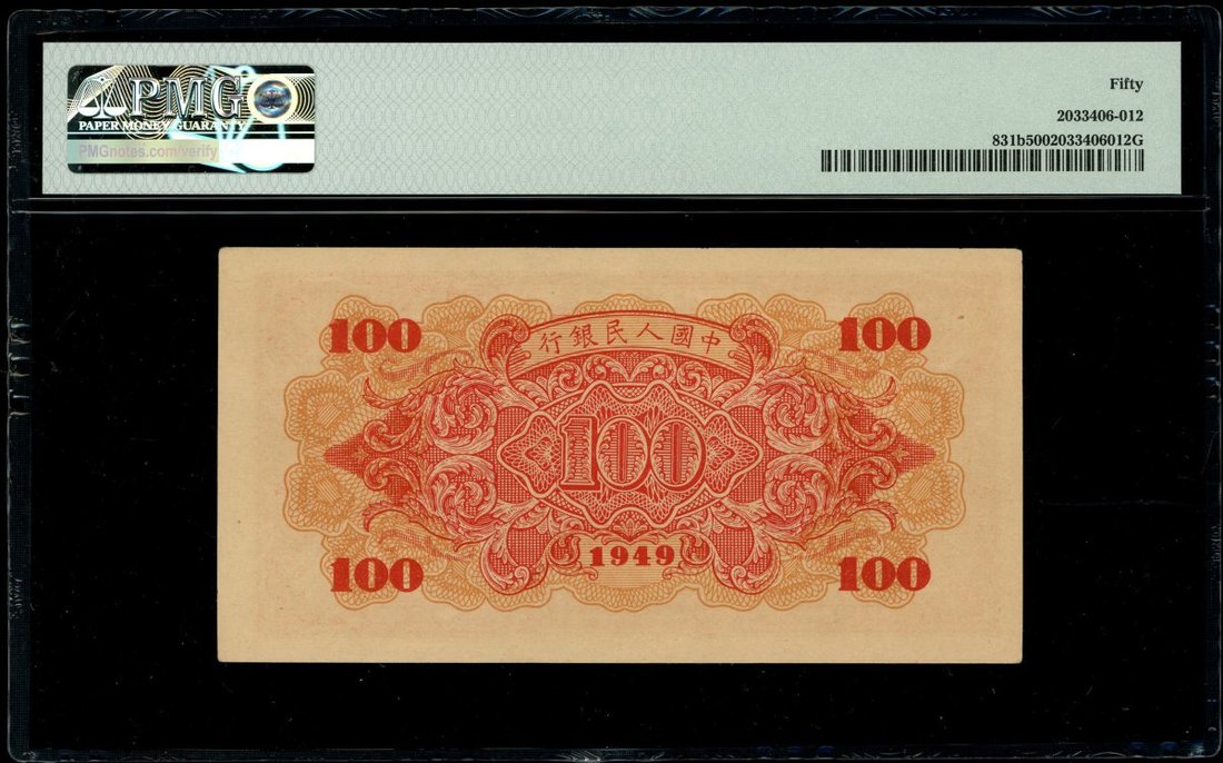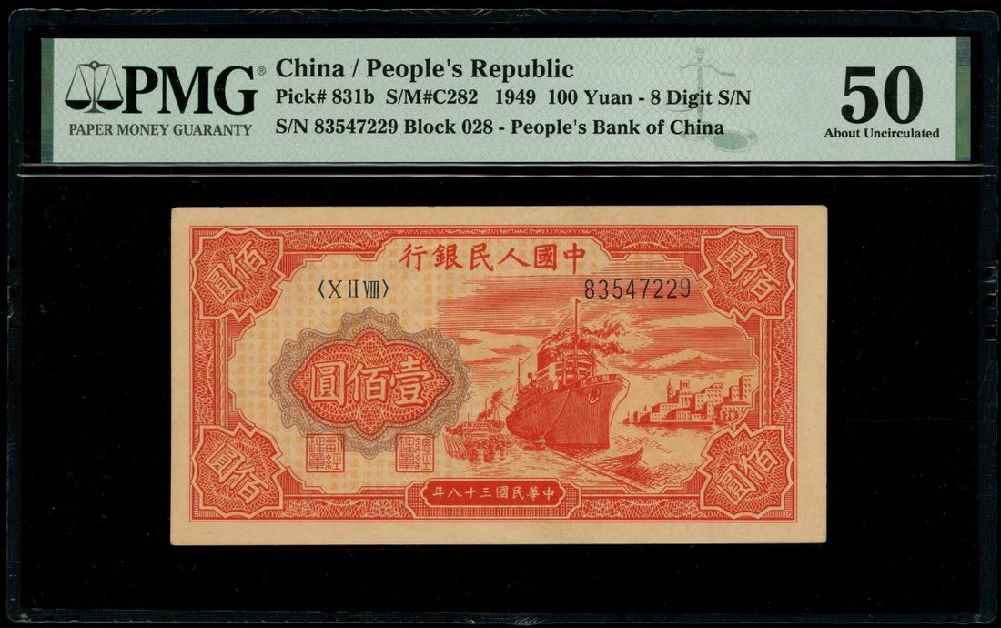 1949年中國人民銀行第一版人民幣100元「紅輪船」,編號X II VIII 83547229,PMG 50