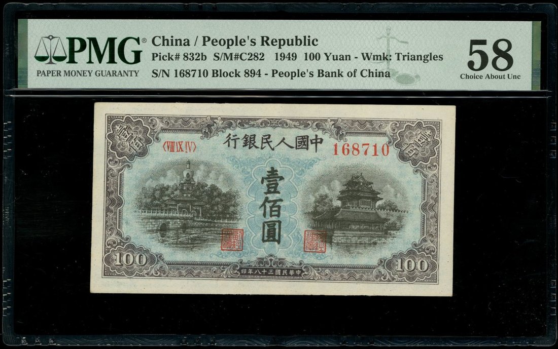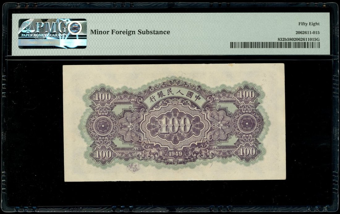 1949年中國人民銀行第一版人民幣100元「藍北海橋」,編號VIII IX IV 168710,PMG 58,輕微外附物